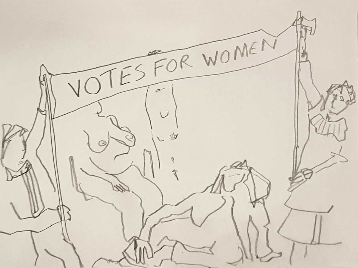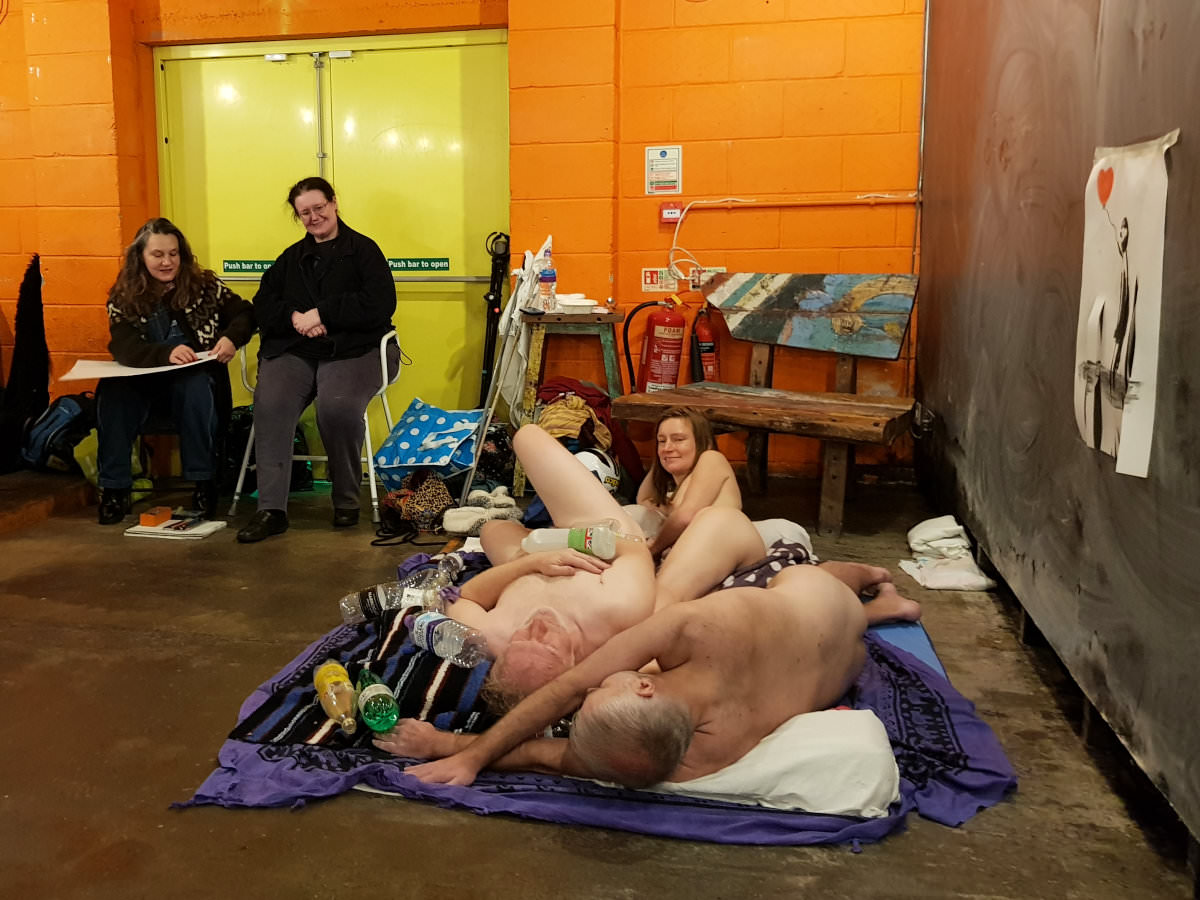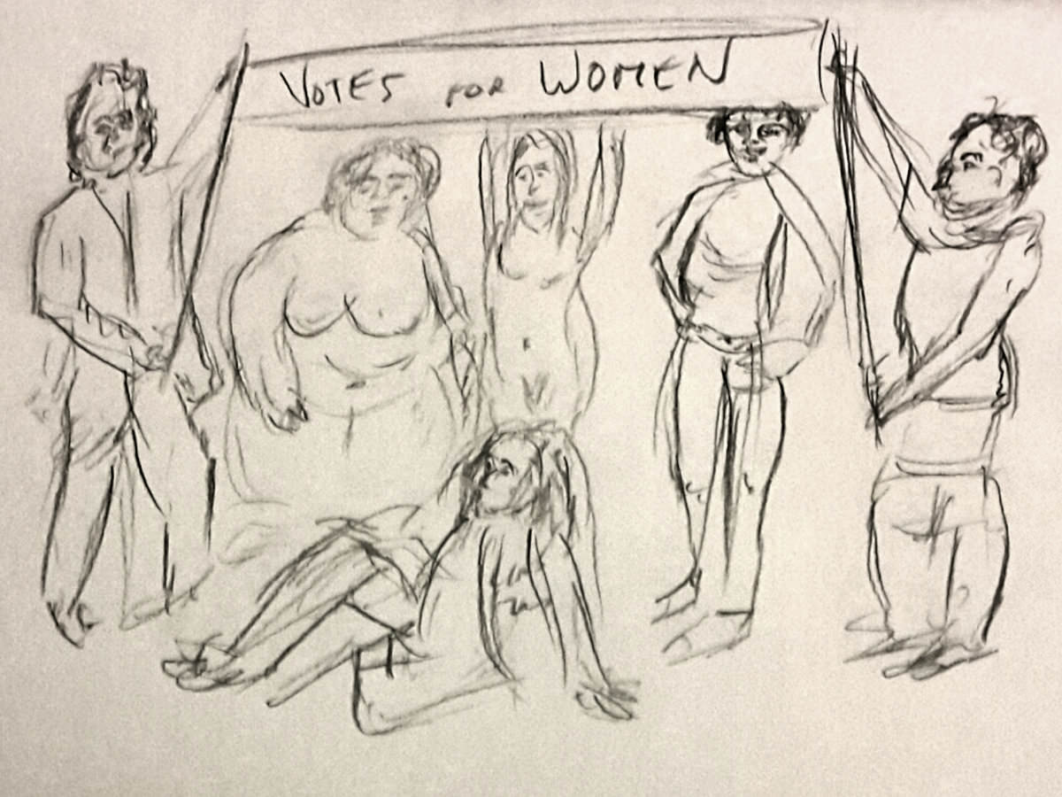 A giveaway for this anniversary pose was a large banner declaring ‘Votes for Women‘. Several women in the room stepped forward to take part in this one, but a lack of heat meant only Lucy had the courage to pose nude alongside Esther; Lidia, Judit, Daniela and Paula all kept their clothes on – possibly a first time ever for Paula!