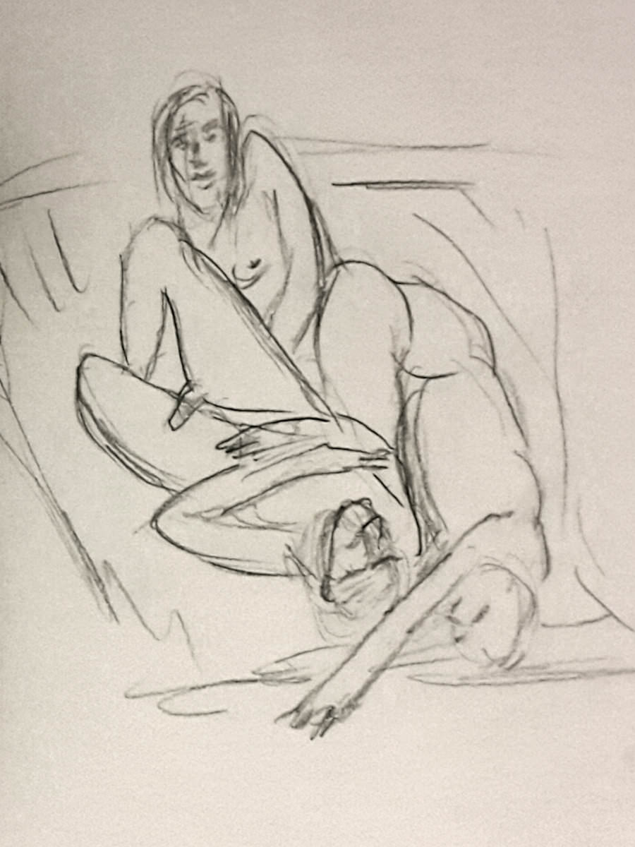 When Esther was invited to stage one of her Spirited Bodies events at The Doodle Bar in Bermondsey, it was an opportunity to present something new. Multi-model life drawing would meet current affairs in Have I Got Nudes for You. Esther herself was to be modelling, alongside me, Lucy (former Spirited Bodies organiser), and Rodger, our friend who made his Spirited Bodies debut in 2012 at the same event as me.