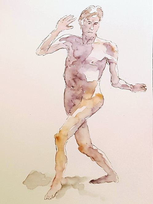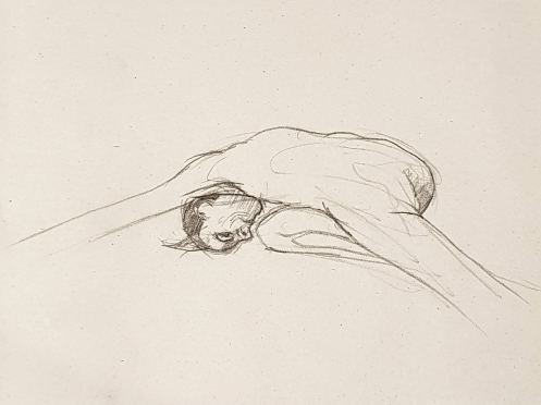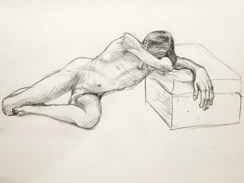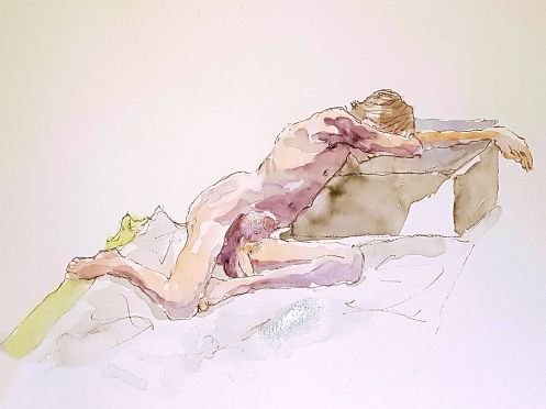 After tea and Tanja’s spiced German biscuits, we finished the evening with a dynamic standing pose of 20-minutes, followed by a forward semi-reclining pose of 25-minutes. There was nothing of Schiele in these two, just my own angled torso. Our artists gave it their full serene attention, producing some excellent work. This was my penultimate session of the year and I thoroughly enjoyed sharing it at a Jolly Sketcher group.