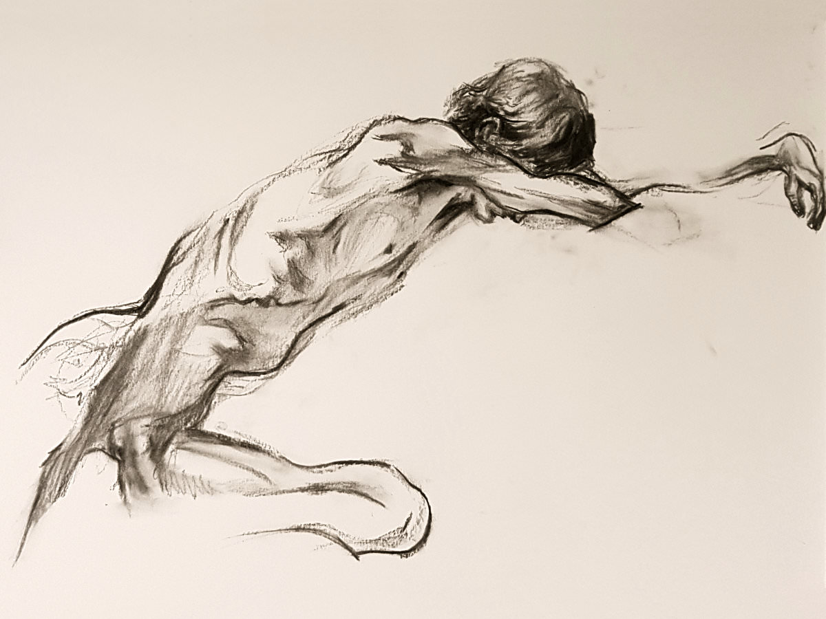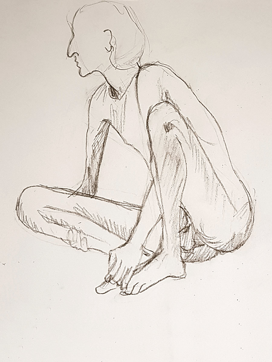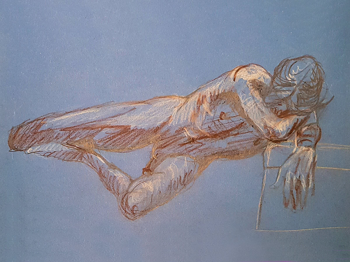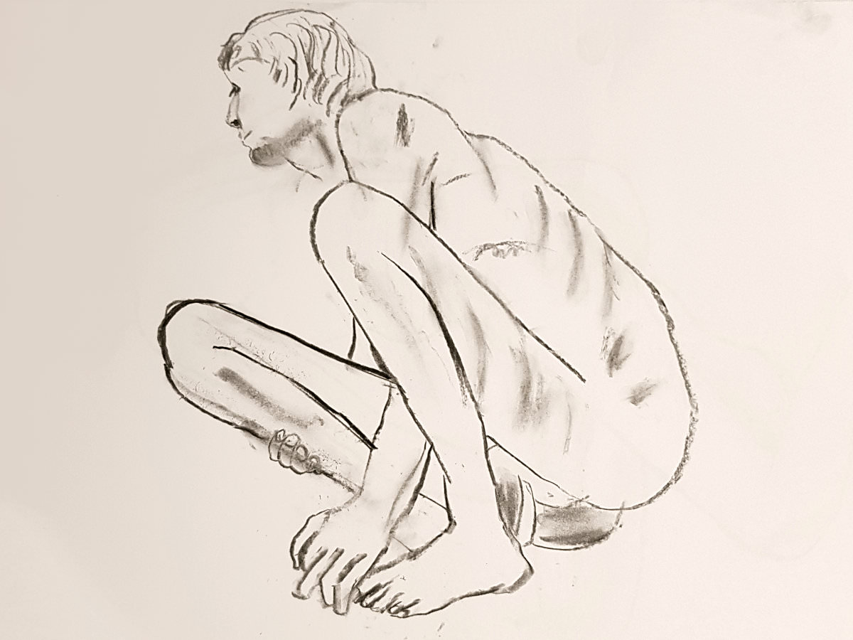 After tea and Tanja’s spiced German biscuits, we finished the evening with a dynamic standing pose of 20-minutes, followed by a forward semi-reclining pose of 25-minutes. There was nothing of Schiele in these two, just my own angled torso. Our artists gave it their full serene attention, producing some excellent work. This was my penultimate session of the year and I thoroughly enjoyed sharing it at a Jolly Sketcher group.
