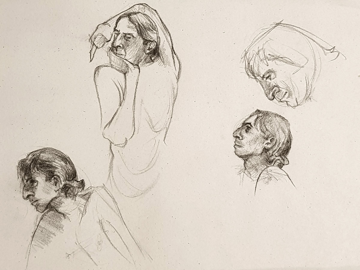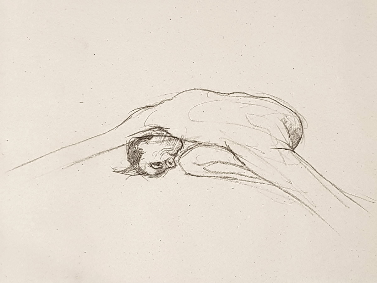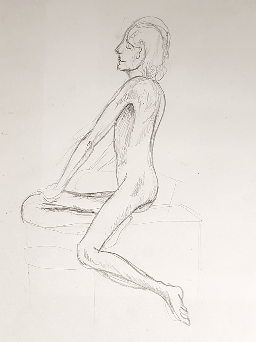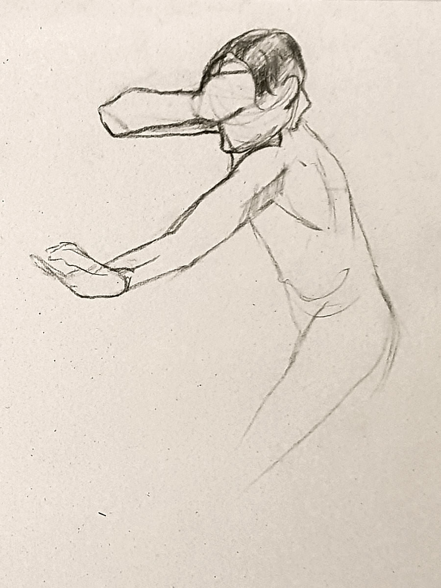 After tea and Tanja’s spiced German biscuits, we finished the evening with a dynamic standing pose of 20-minutes, followed by a forward semi-reclining pose of 25-minutes. There was nothing of Schiele in these two, just my own angled torso. Our artists gave it their full serene attention, producing some excellent work. This was my penultimate session of the year and I thoroughly enjoyed sharing it at a Jolly Sketcher group.
