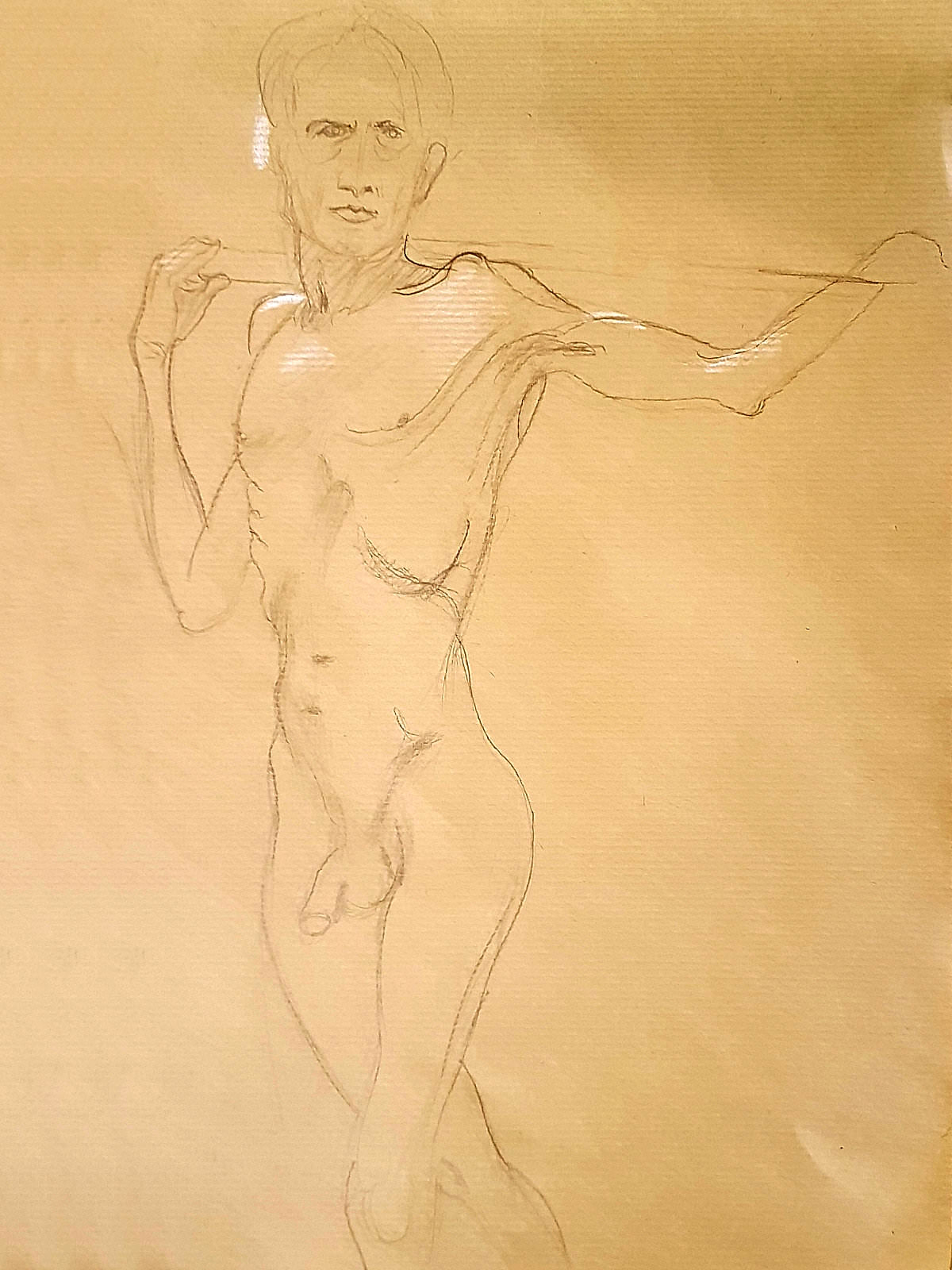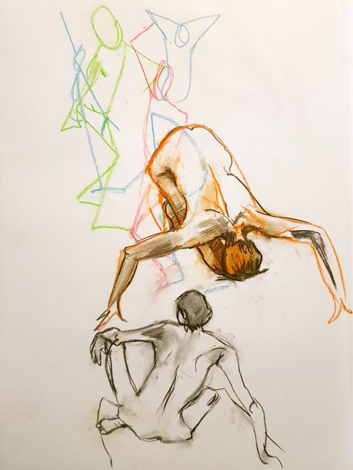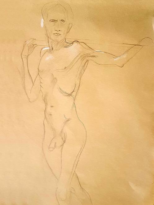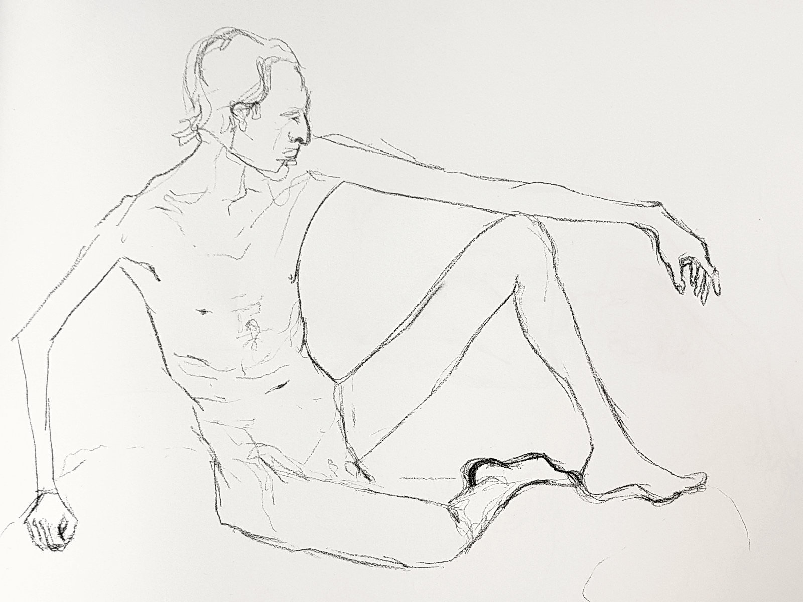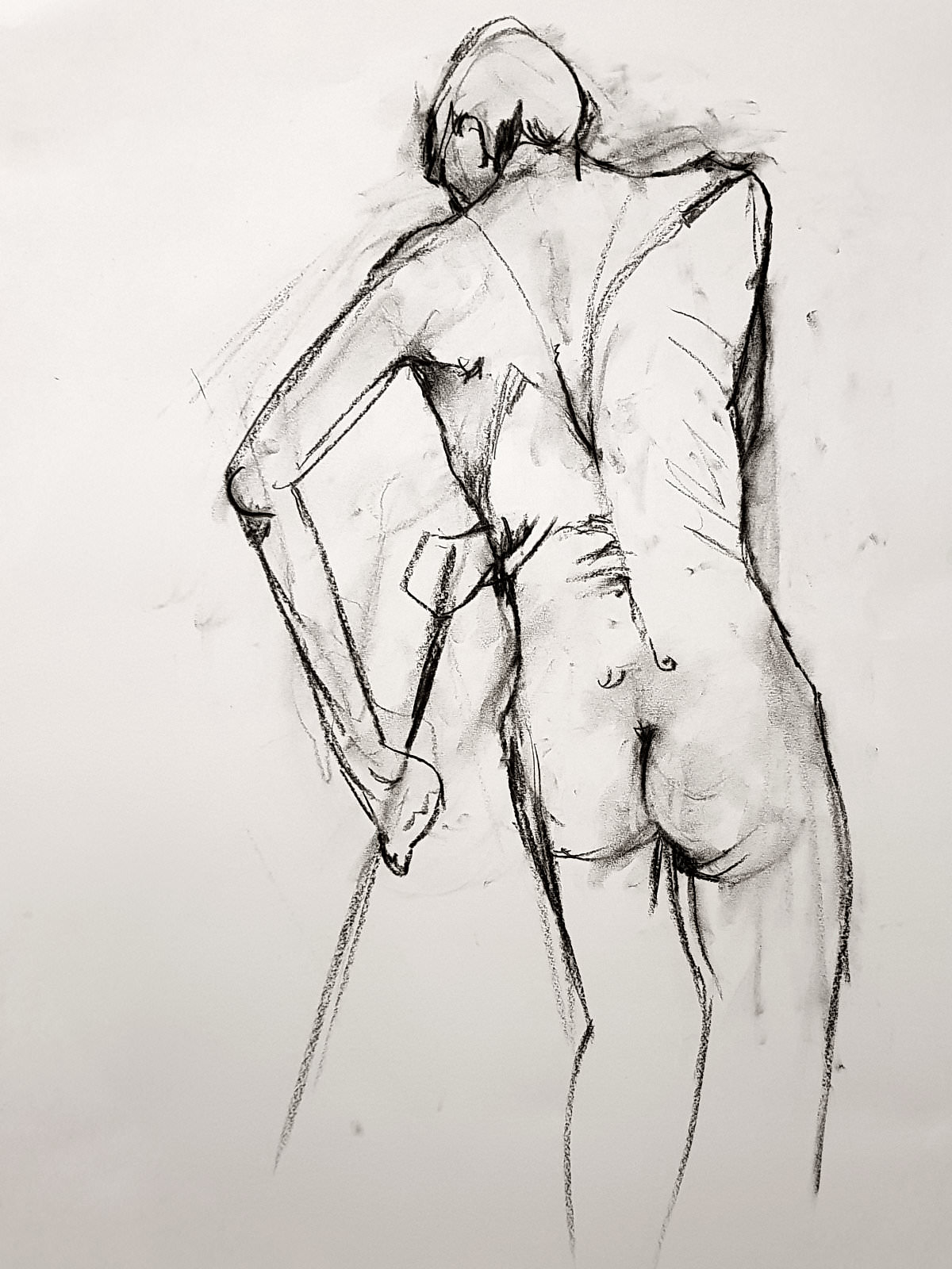 It was quite crowded, but with room for one or two more people. One person who duly filled a gap during the break was Esther. She would be modelling for the session that followed mine but arrived early to sketch my second half work. The group’s organiser, Tim, handed me sticks to use as props and I resumed with two 20-minute poses.