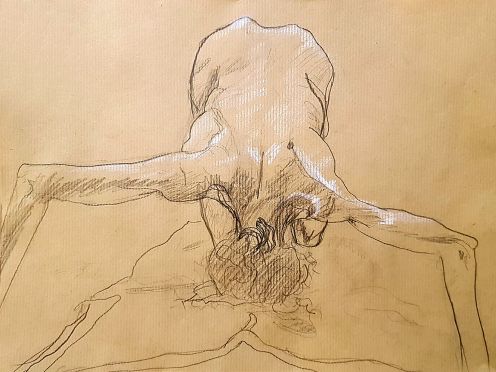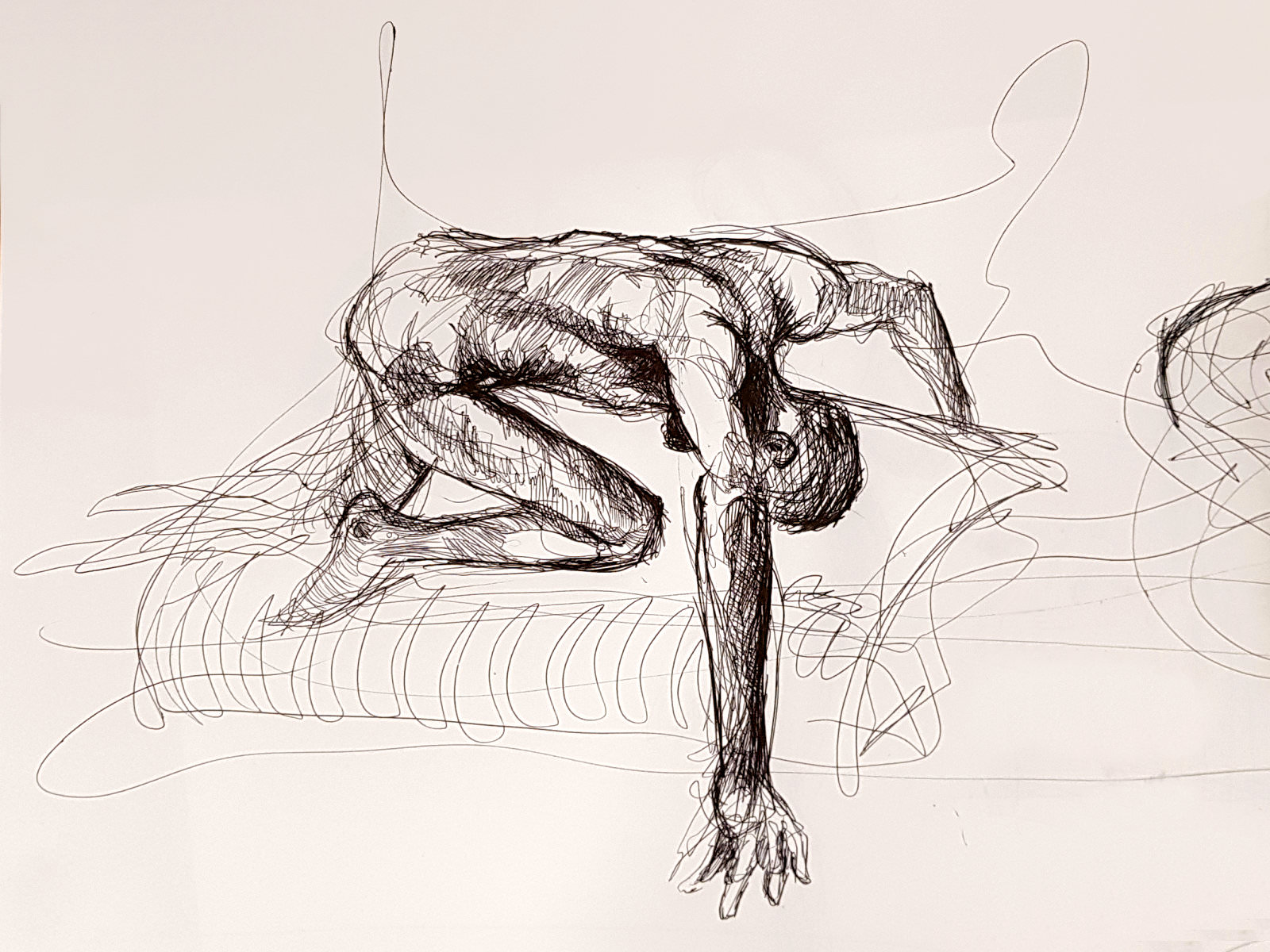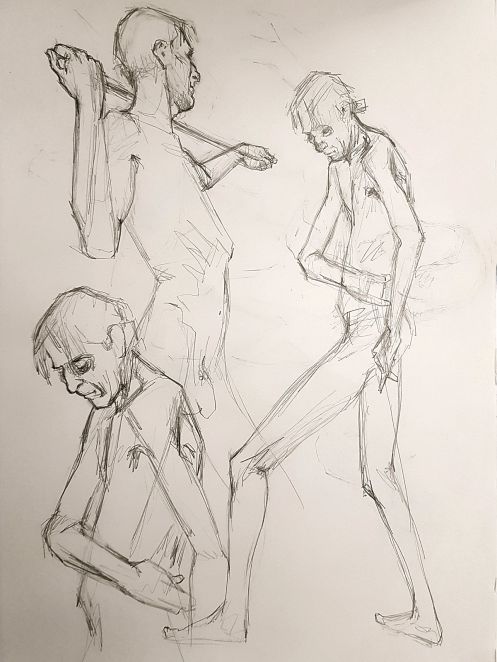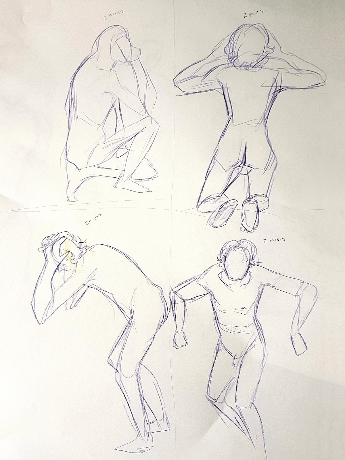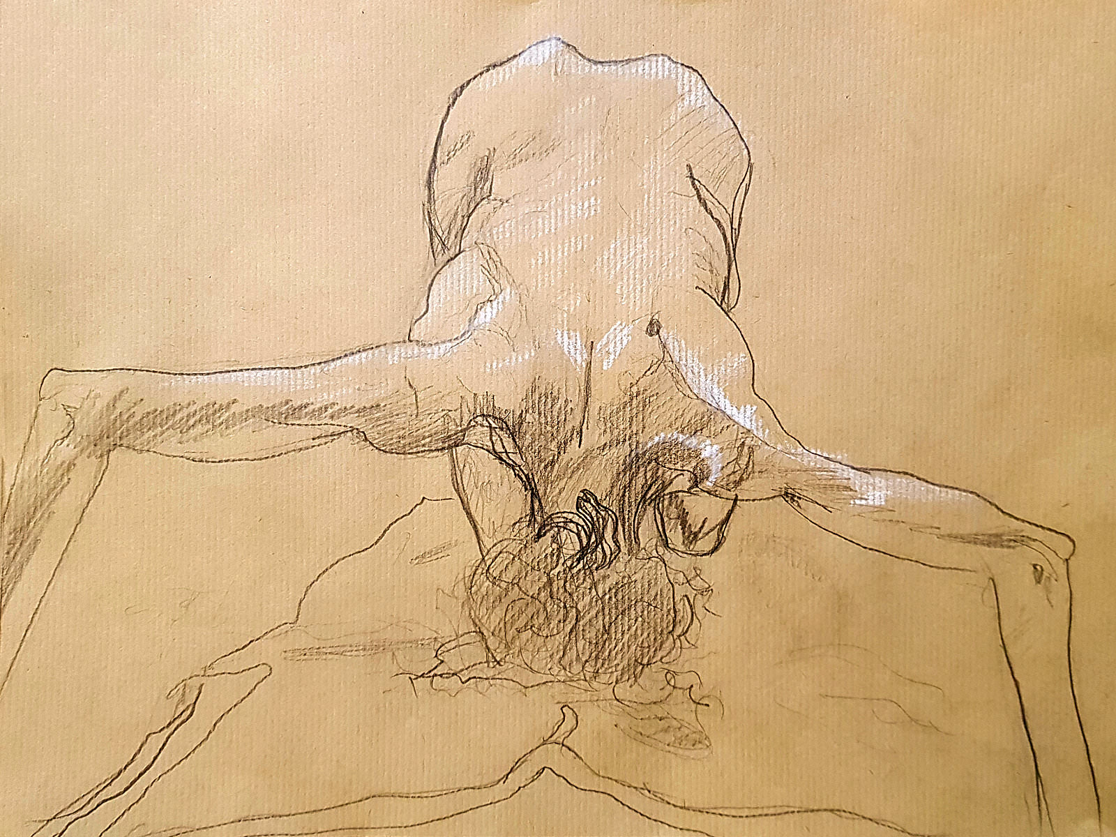 It was quite crowded, but with room for one or two more people. One person who duly filled a gap during the break was Esther. She would be modelling for the session that followed mine but arrived early to sketch my second half work. The group’s organiser, Tim, handed me sticks to use as props and I resumed with two 20-minute poses.