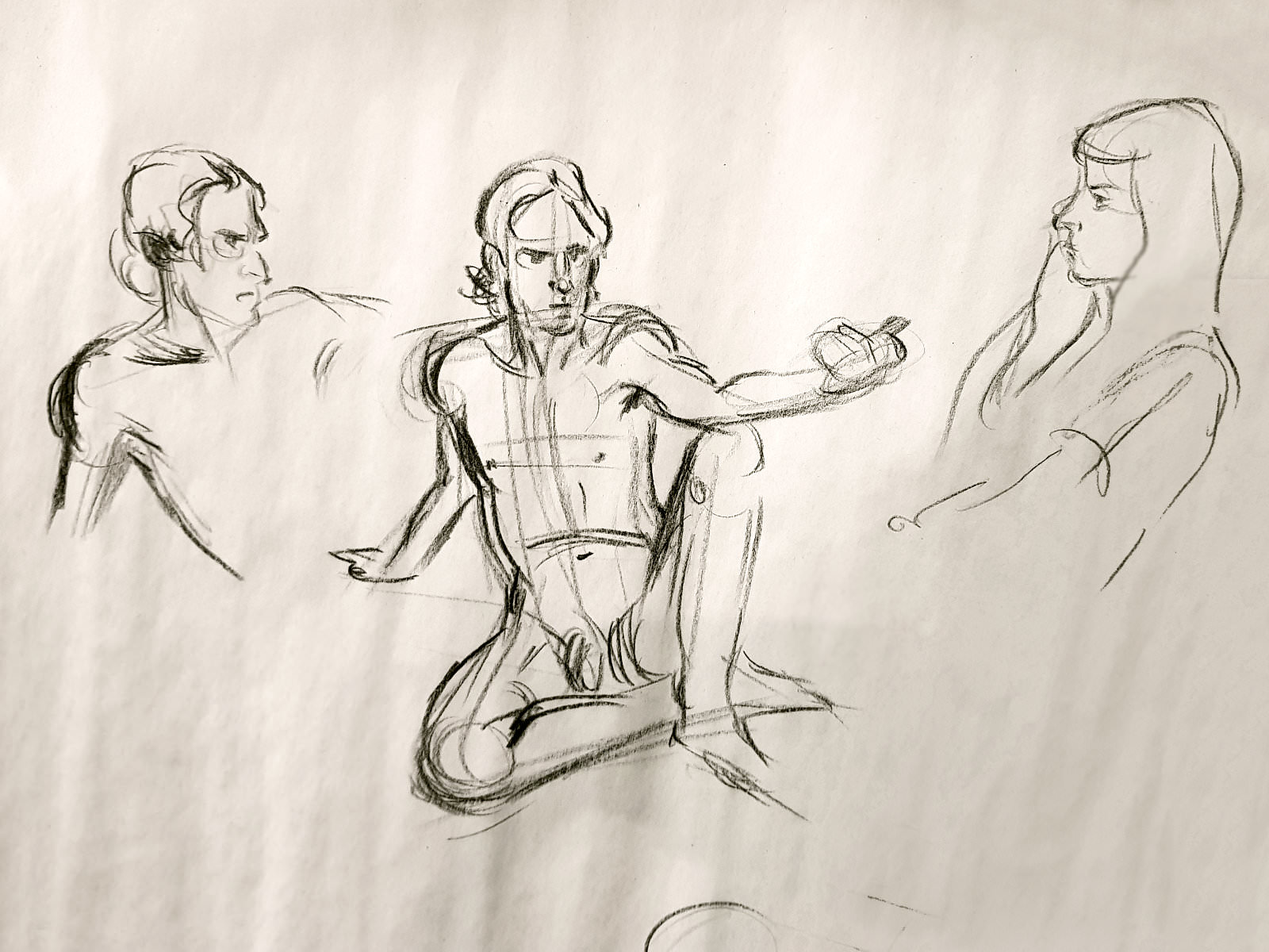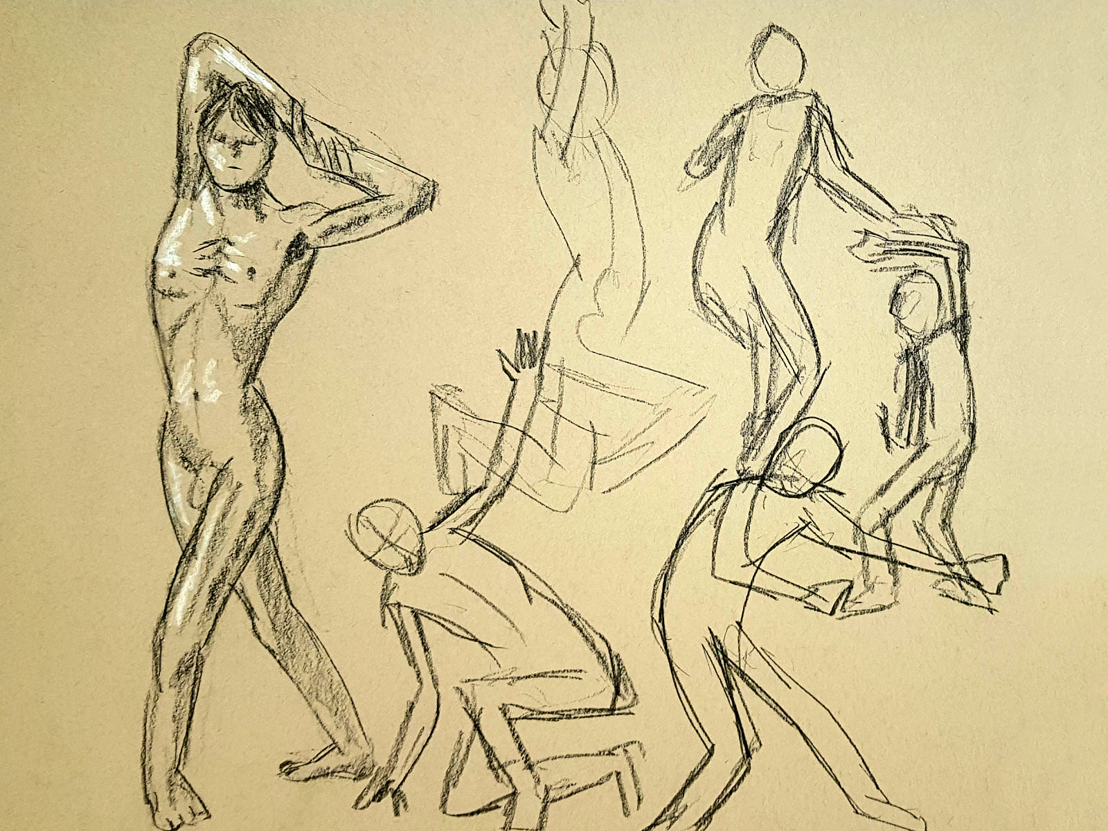 When the session started at 7pm, I opened with a 15-minute standing pose. I located the optimum off-centre spot from which to give the clearest views along the maximum number of sight-lines. Five 1-minutes poses followed, then 5, 10 and 20-minutes.