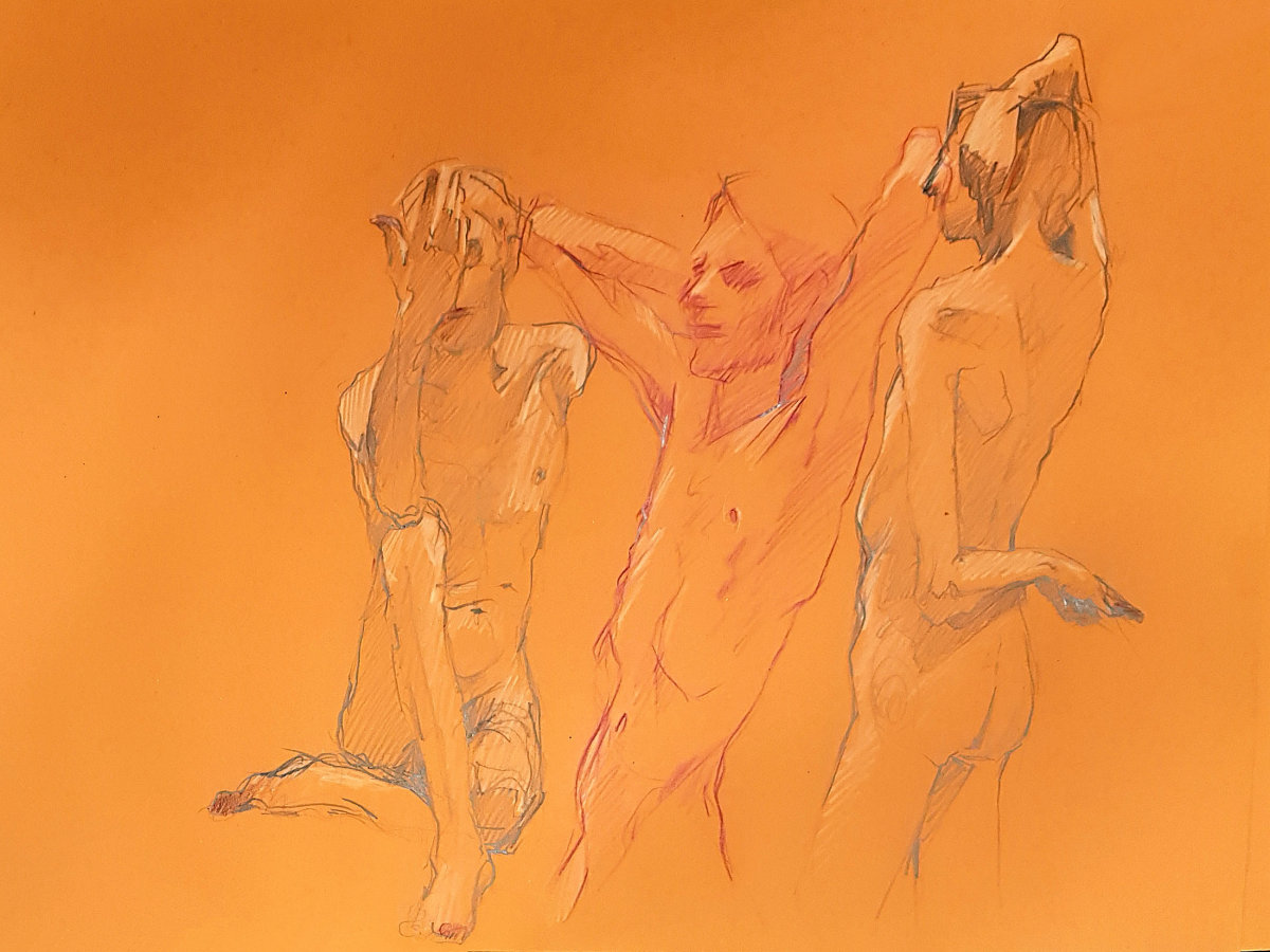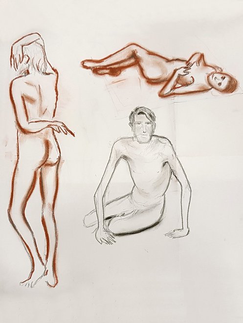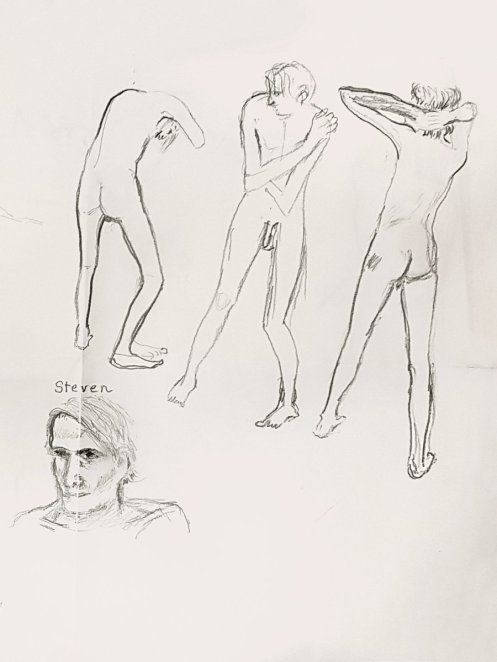 During the break I talked with a few of the artists. One woman said it was her first time life drawing, and that right until the last moment she assumed she would be sketching “a bowl of fruit or some flowers“. In fairness, she responded to the sudden unexpected appearance of a naked man, with composure and an increasingly confident line.