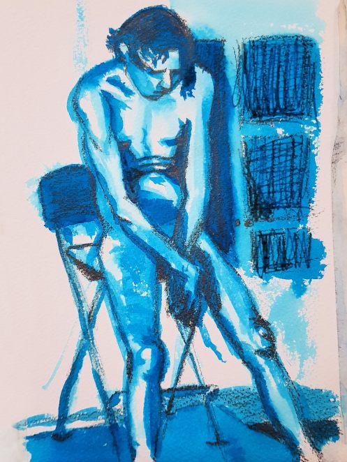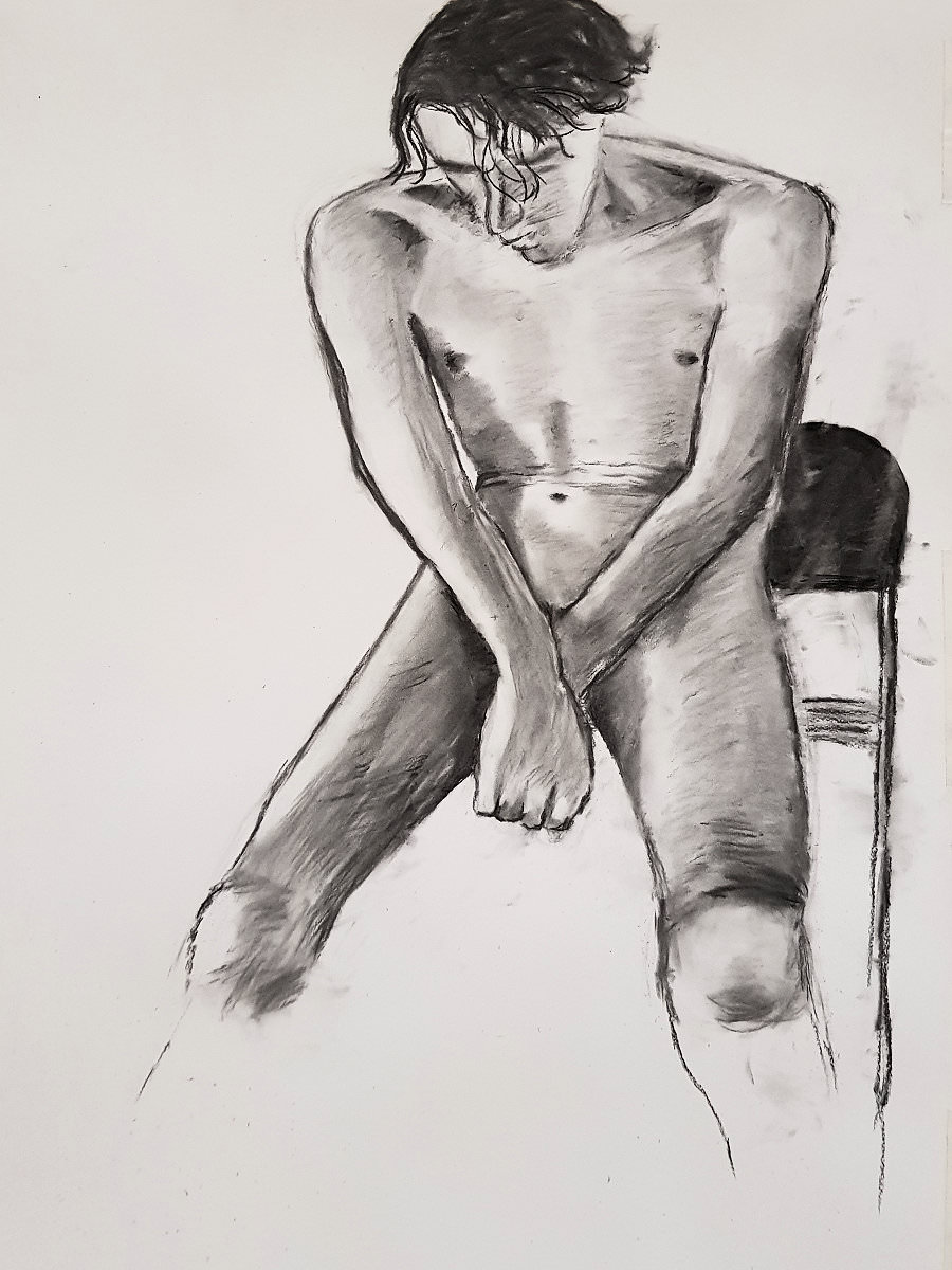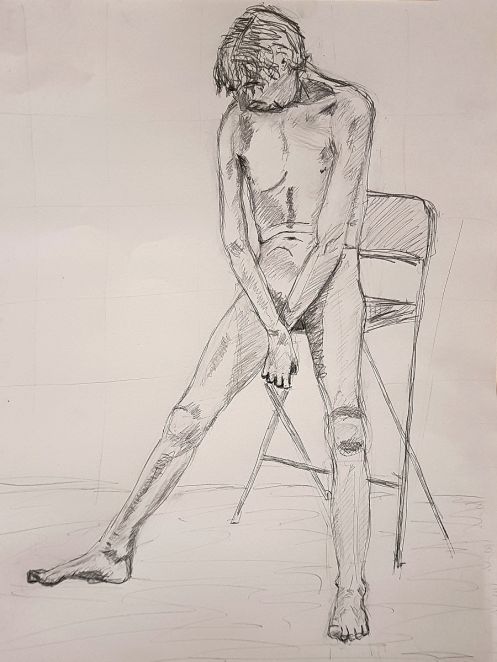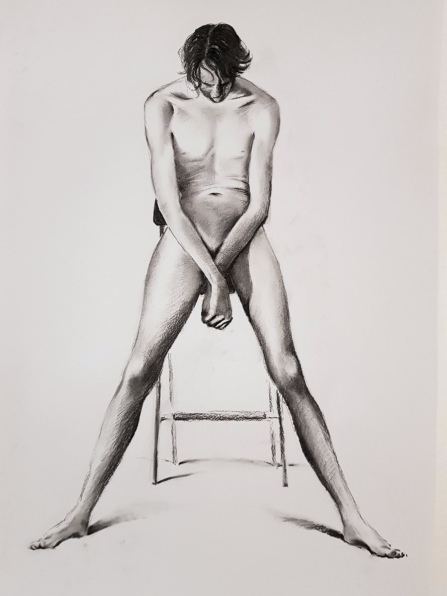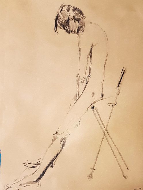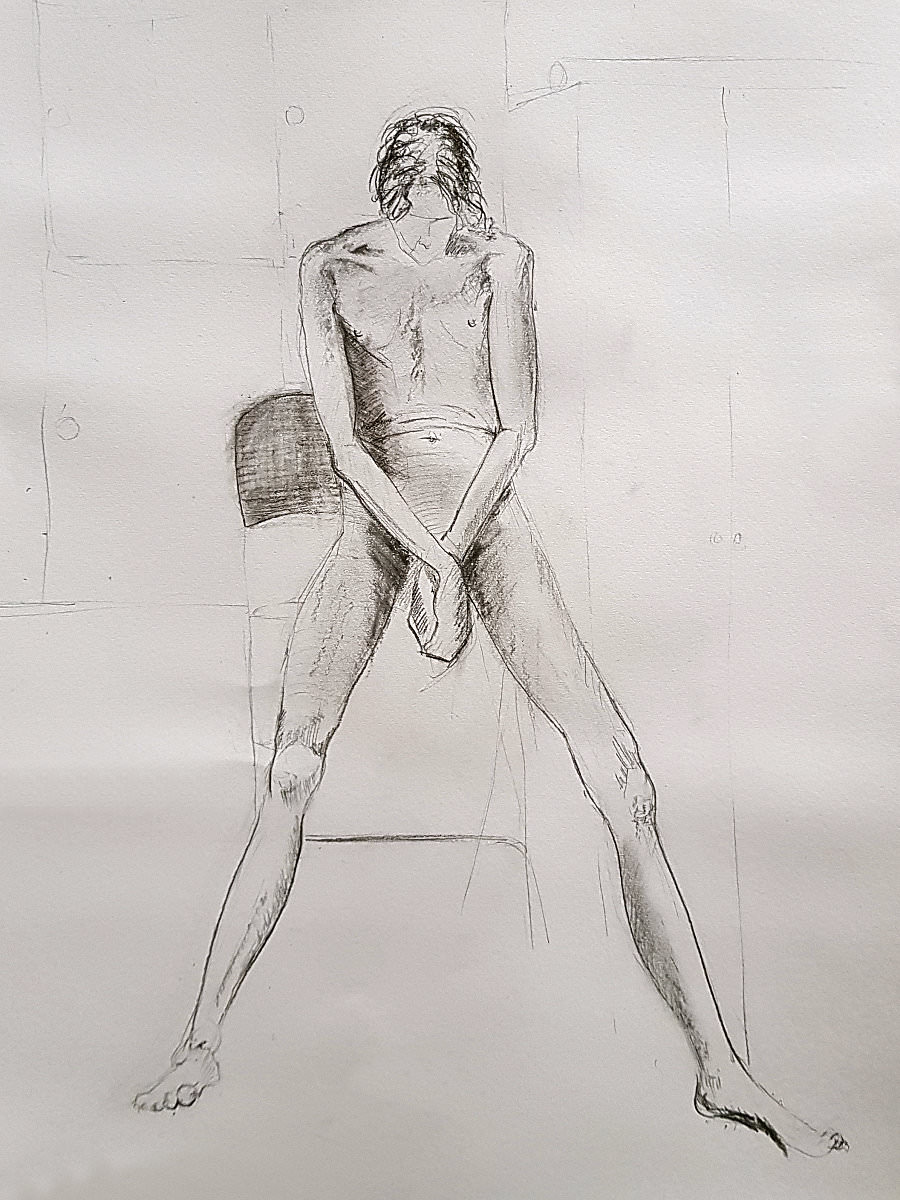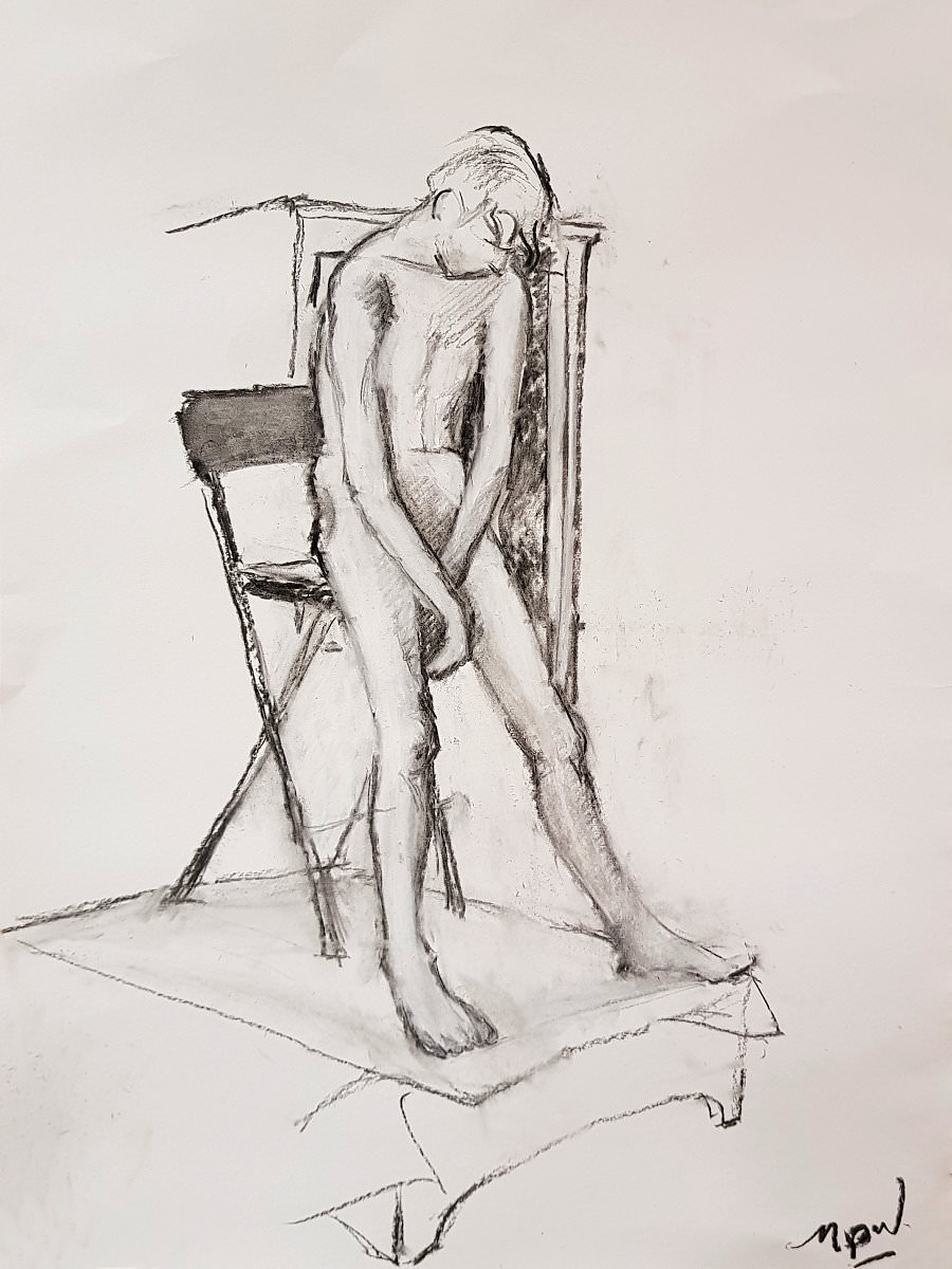 I was asked to recline for the long pose on my last two visits to The Conservatoire in Blackheath, and before that I was seated, so I now felt a professional duty to stand. A plan was agreed in conversation with tutor Victoria Rance, but first I would begin with the usual short format: three 1-minutes poses, one of 5-minutes, one of 10-minutes.
