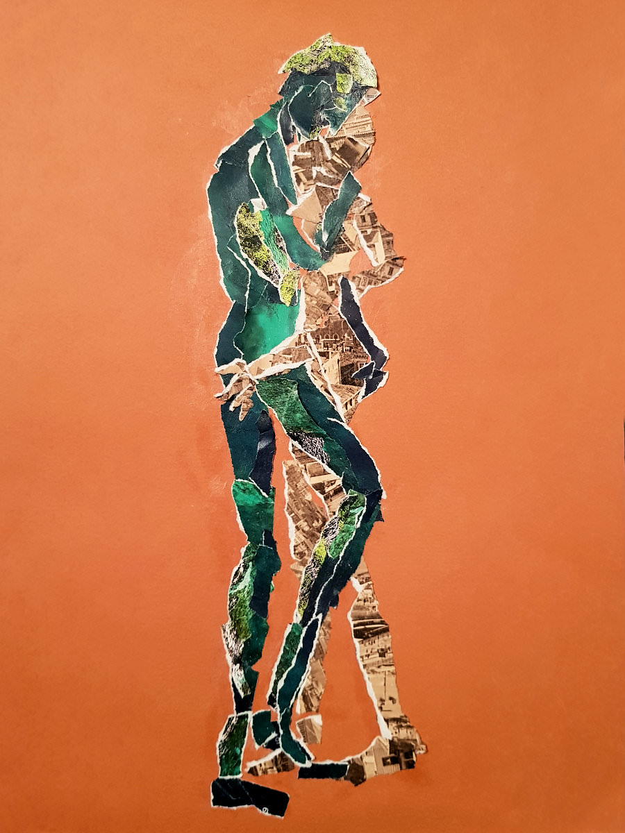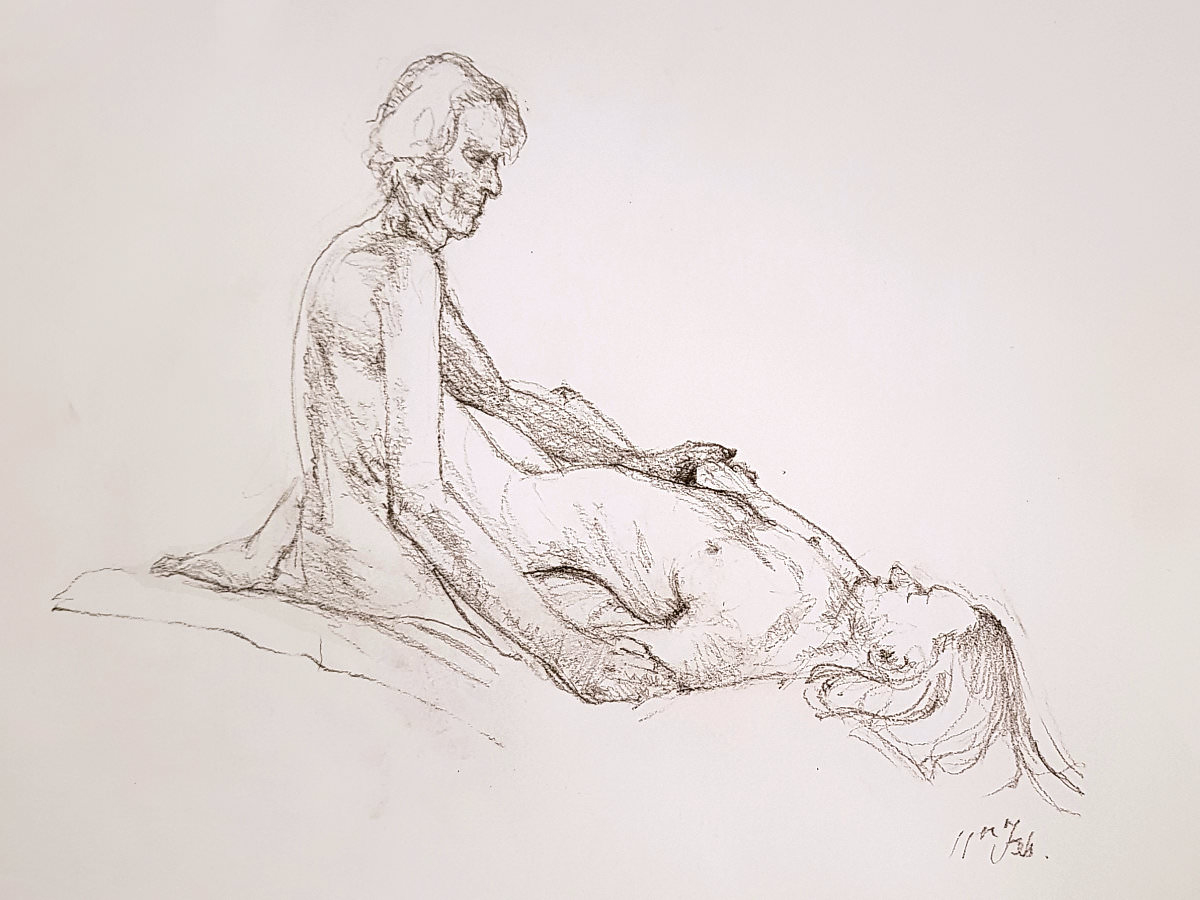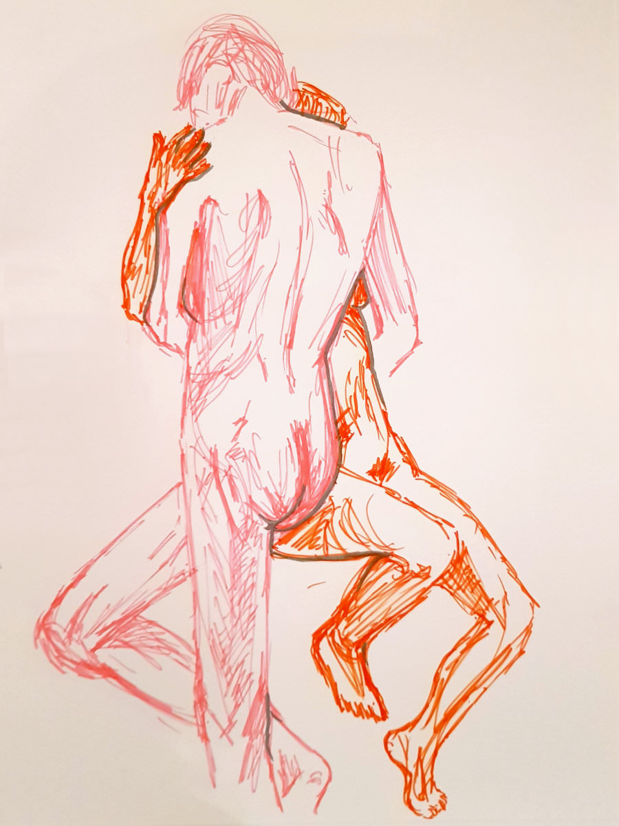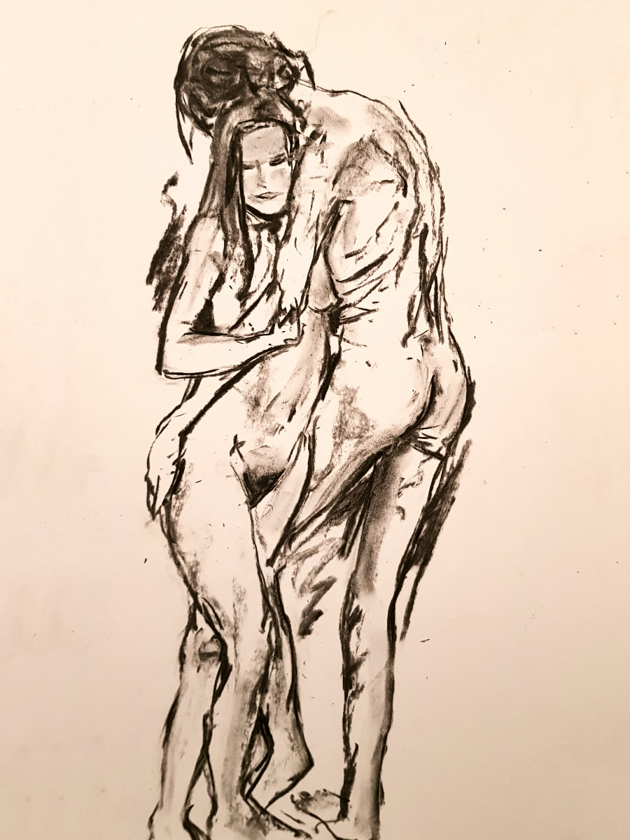 The structure for our poses together was to be three of 15-minutes each, taking us to an interval, then two of half-an-hour to complete the session. For the first of these, we stood in an embrace. Posing in the round, however, we can’t cuddle fully front-to front as all any of the artists would be able to see is our backs. Ergo we arrange ourselves into a sort of semi side-to-side alignment. It’s less comfortable but more drawable.