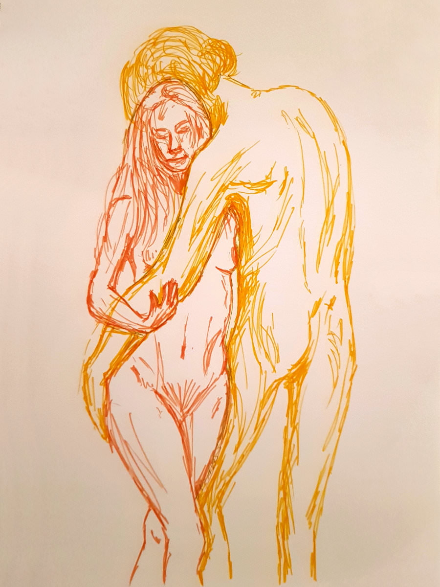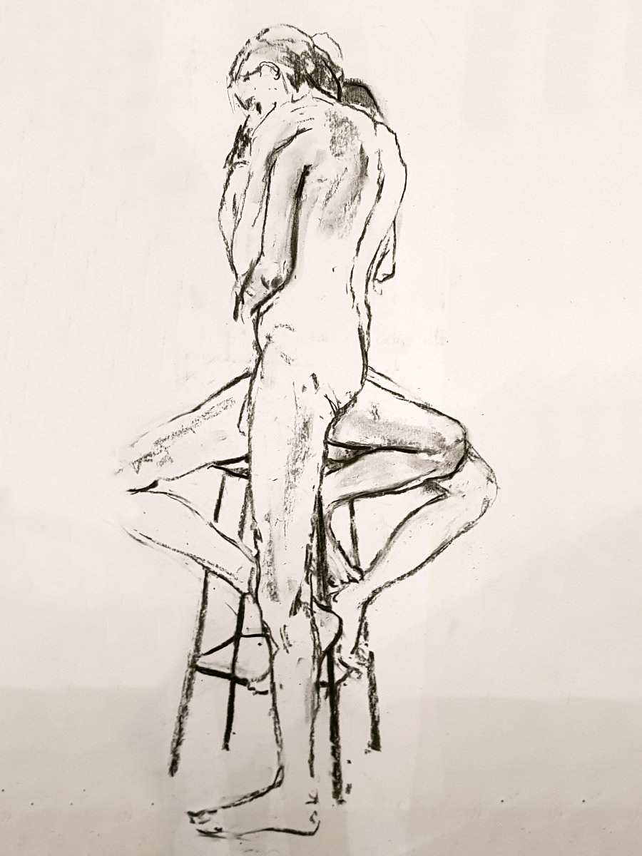 Group organiser, Julia greeted us when we arrived but then, as she was feeling rather poorly, left us in the very safe and capable hands of her partner, Edward. The three of us together agreed pose timings for the evening, and at 7pm we started with warm-up poses – two of 2-minutes. This is way too short for capturing two figures so we began solo and swapped ends of the room at the change-over.