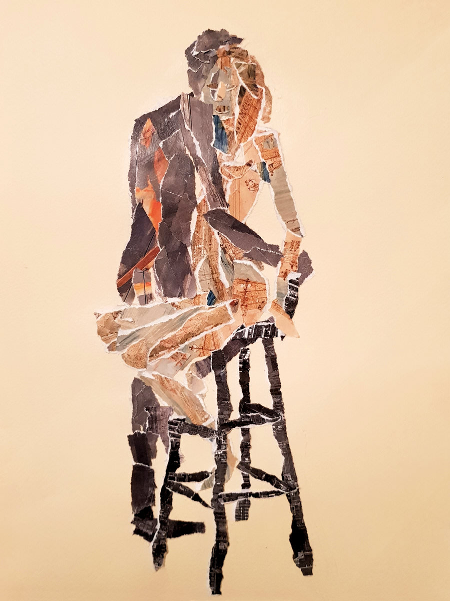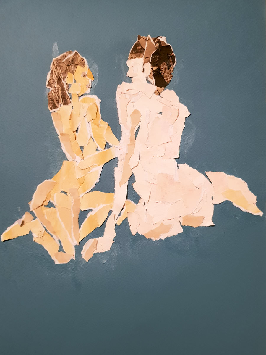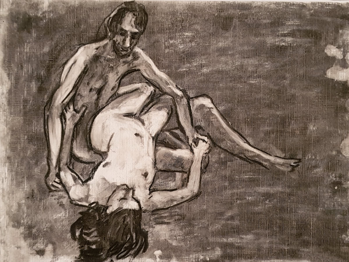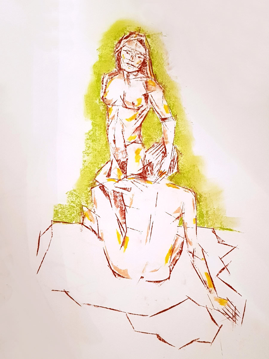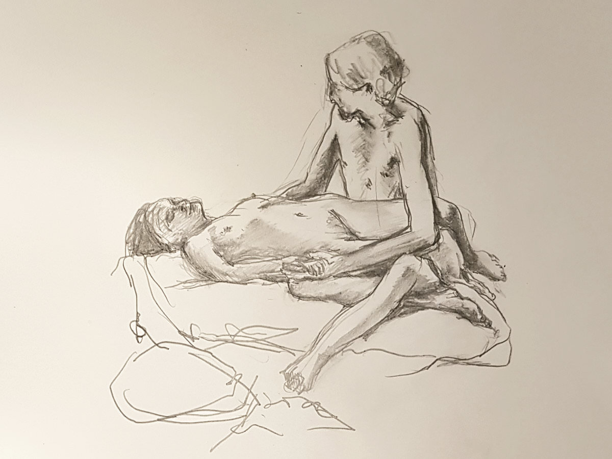 For the second 15-minute pose we sat close together on the floor, gazing face-to-face but bodily apart, with just hands making physical connection. The first half ended with Esther sitting on a stool and our bodies once more hugging sideways. After the break we resumed with Esther standing and me wrapped round her legs, and finally I sat on the floor while Esther lay across my lap. Serene.