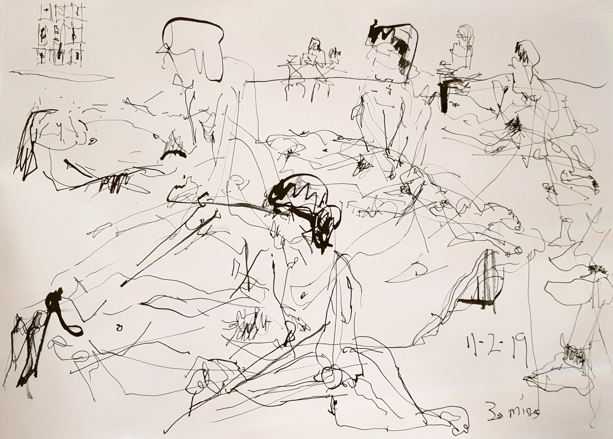 The session overran, but we were quite content. Our efforts appeared to be very much appreciated by those drawing us, and there were some superb artworks to show for it. Edward and Julia are among the nicest, most attentive and considerate organisers for whom we have the pleasure of working. Lastly a word about the creation below, called a “landscape of limbs” by the chap who drew it. I like to think of it as… a ‘limbscape‘.