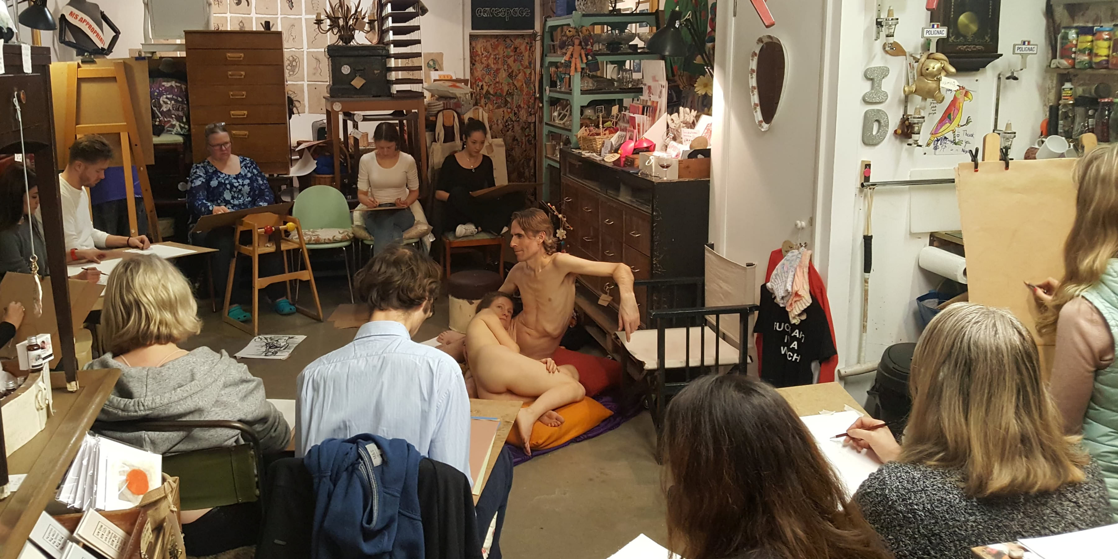 The last duo booking of the Valentine’s season for me and Esther was for life drawing at cave in Pimlico. As ever, we were greeted with great warmth by Karen, the owner and driving force behind this artist-led retail space for ‘art, vintage and up-cycling‘. It is truly one of those rare places packed with curios where everything is interesting.