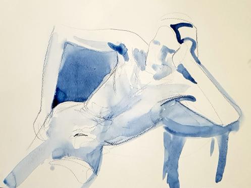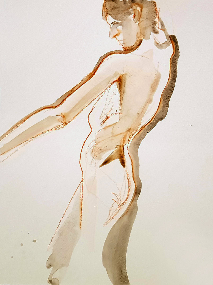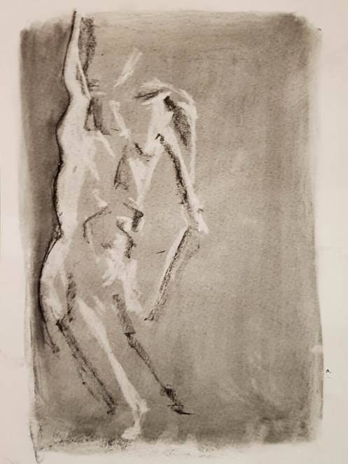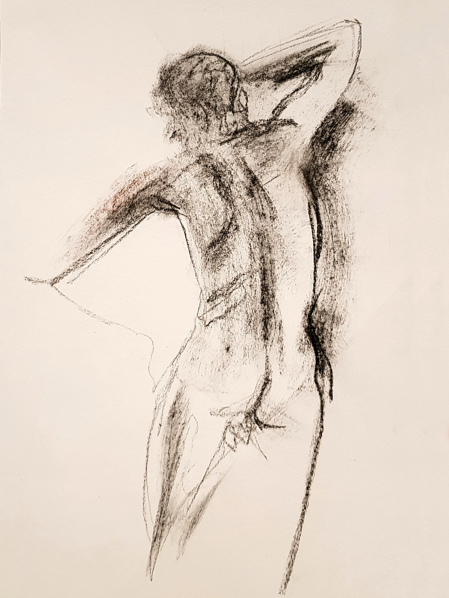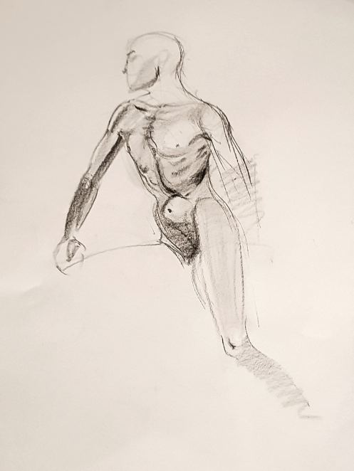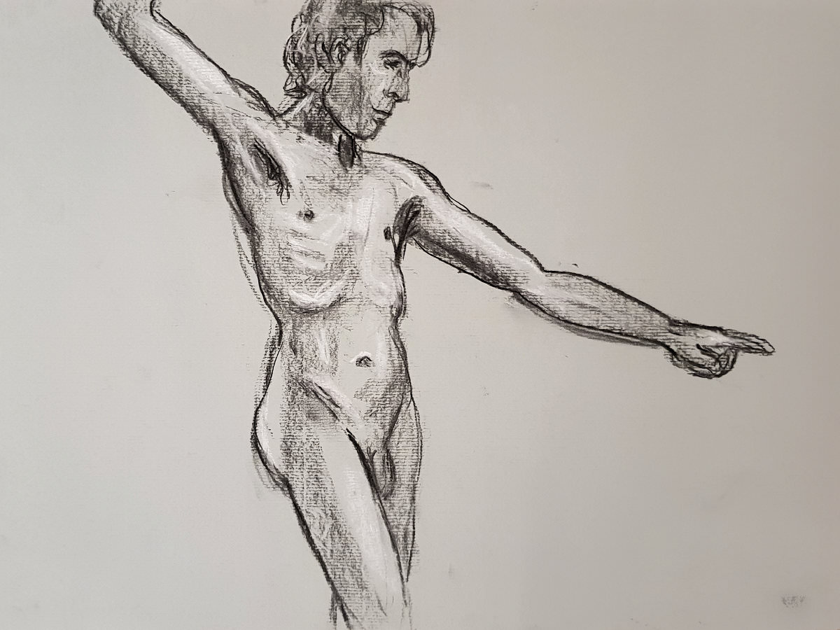We opened with short pose times getting ever-shorter: 5-minutes, 4, 3 and 2-minutes, three of 1-minute, three of 30-seconds. The first half ended with two 10-minute poses starting with a dramatic one-arm-raised, other-arm-pointing stance.