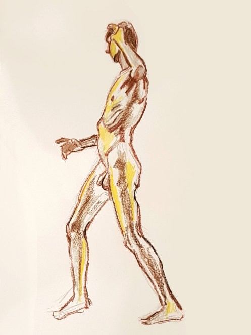 Earlier that day with time to kill in London, I’d popped into the National Gallery shop and leafed idly through some art books in search of pose ideas. An image that caught my eye and inspired me next was ‘La Petite Danseuse de Quatorze Ans‘ by Edgar Degas – albeit I was a 6’4″, 40-something male version. Lastly, I semi-reclined on my front for what turned out to be the least comfortable half-hour of this session. All in all, however, I was happy with my evening’s work and loved the resultant art.