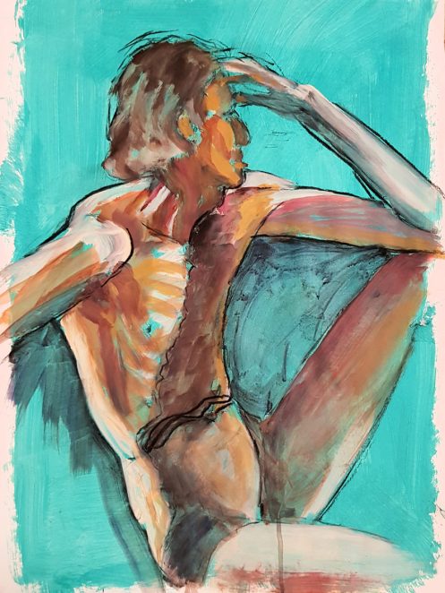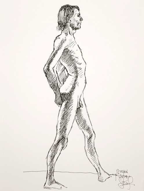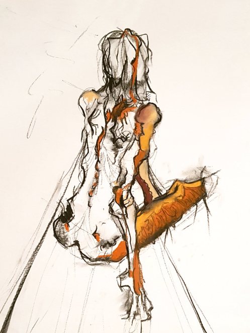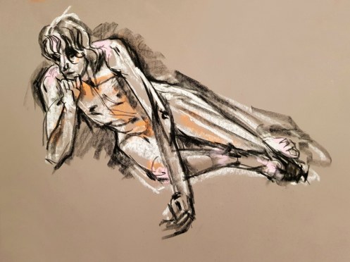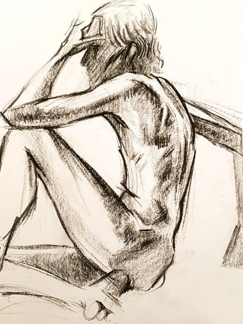 Upon arrival I had found artists already about two rows deep encircling the 15-minute pose space, whereas those awaiting me could be counted upon one hand. Come the 6pm start, however, with a decision on Lily’s transfer still not made, I began to notice more chairs being turned around and easels angled my way. How nice! I followed my standing pose with a seated posture of many angles. This took us to the interval and an opportunity to binge on tea and dark chocolate digestives, which I seized.