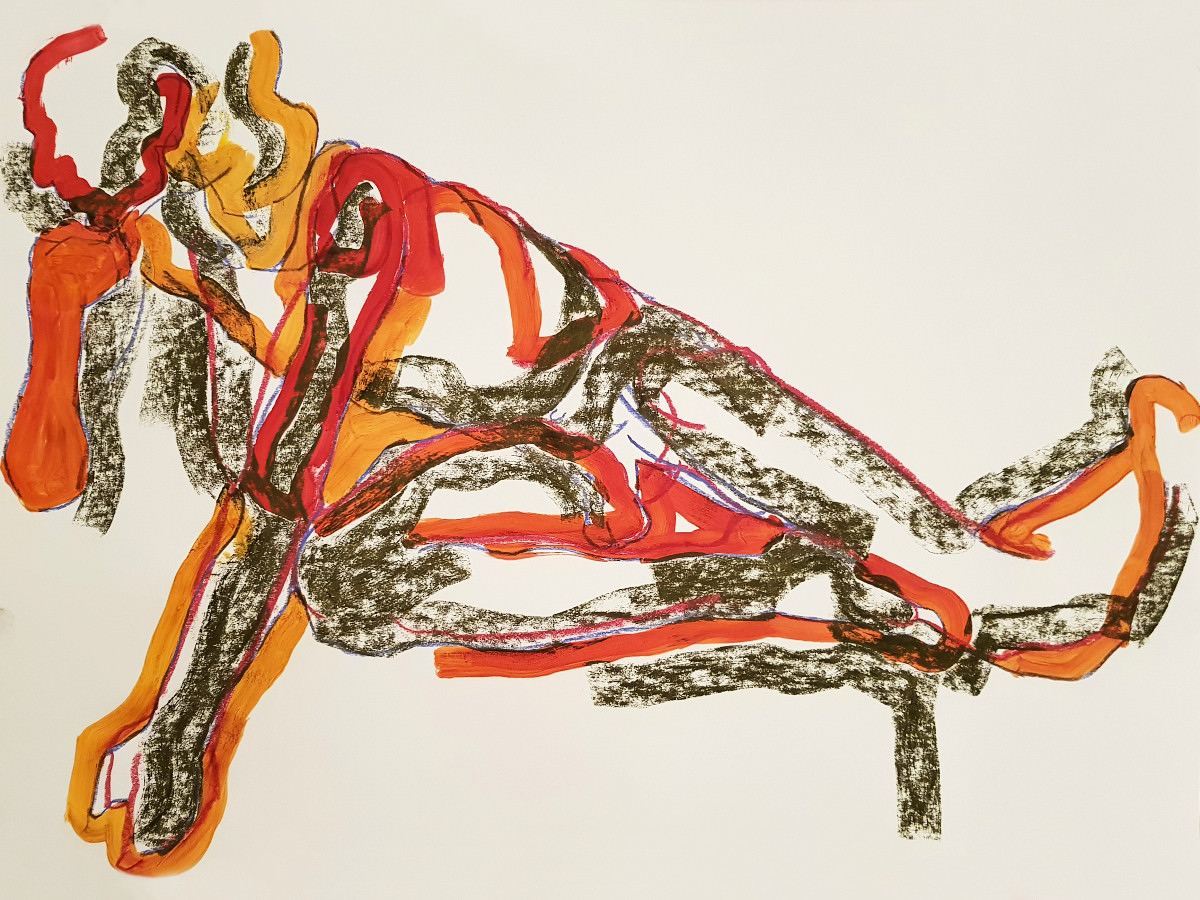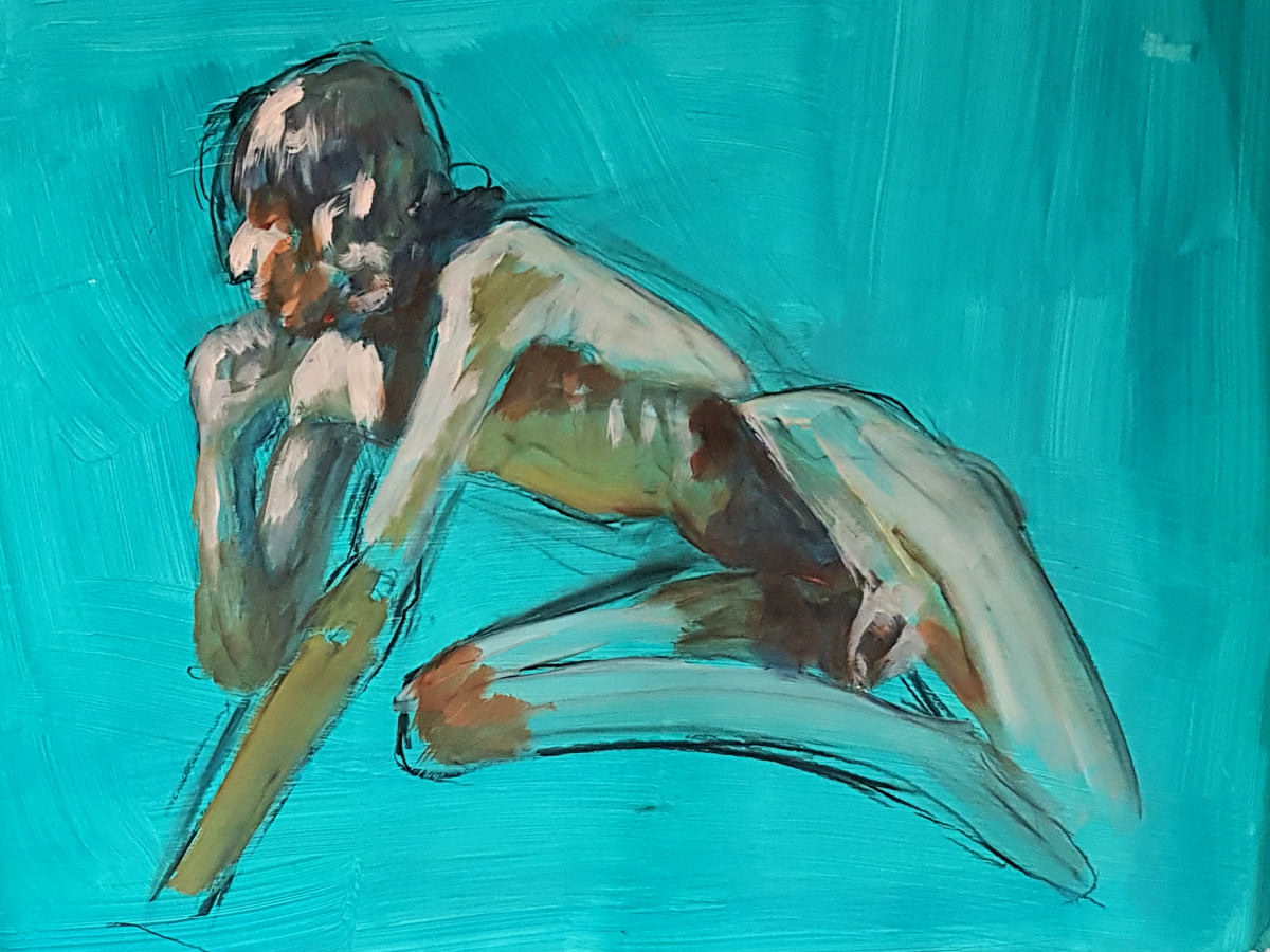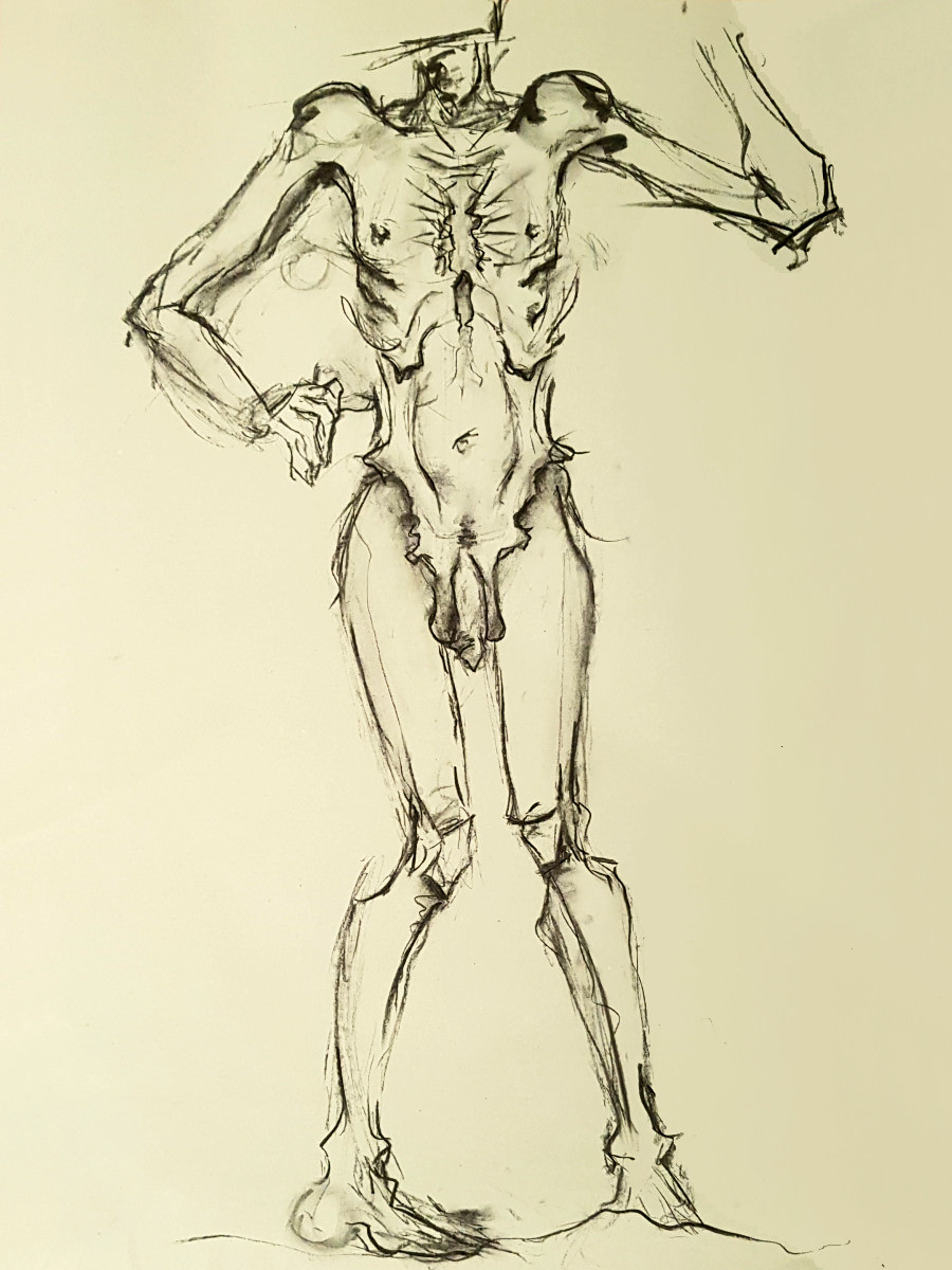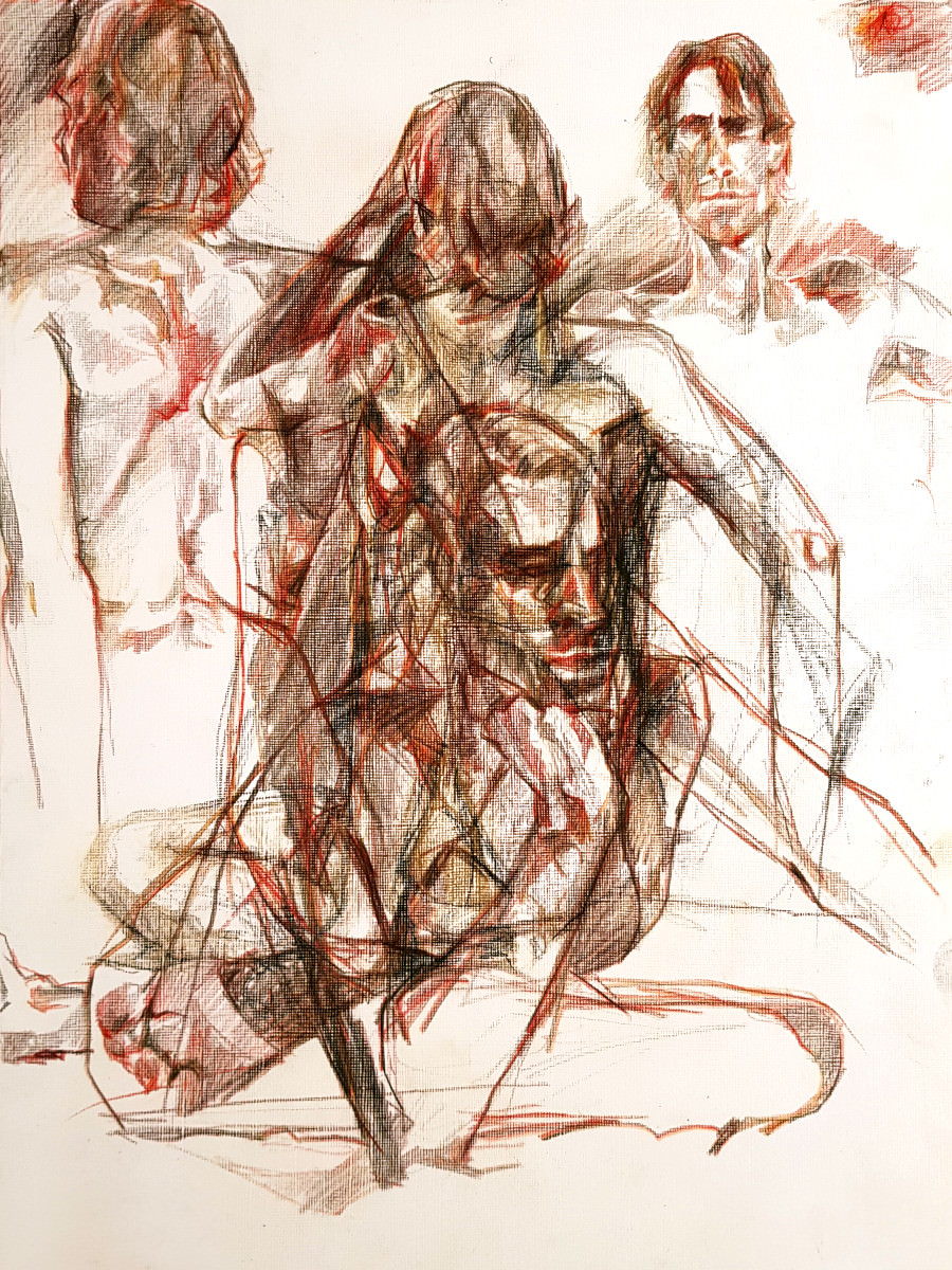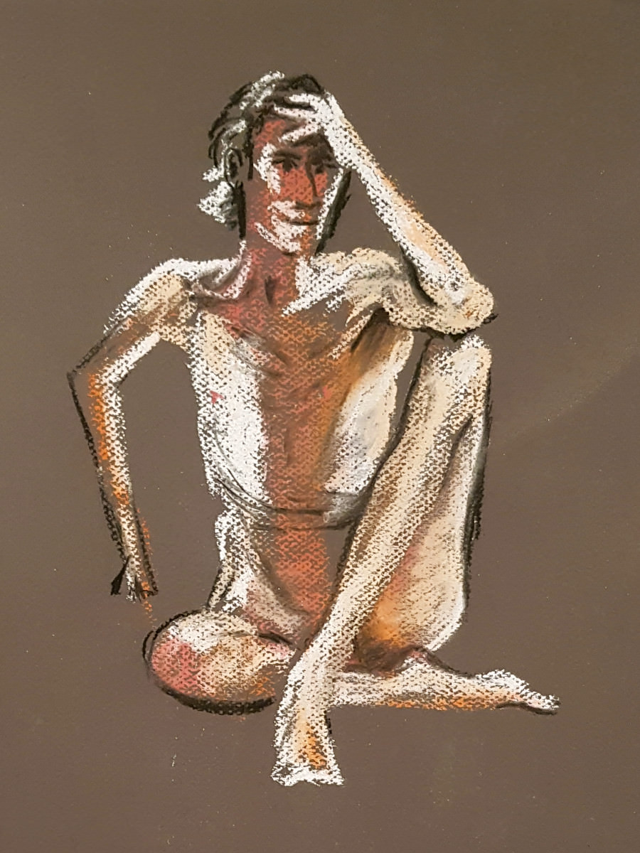 Upon arrival I had found artists already about two rows deep encircling the 15-minute pose space, whereas those awaiting me could be counted upon one hand. Come the 6pm start, however, with a decision on Lily’s transfer still not made, I began to notice more chairs being turned around and easels angled my way. How nice! I followed my standing pose with a seated posture of many angles. This took us to the interval and an opportunity to binge on tea and dark chocolate digestives, which I seized.