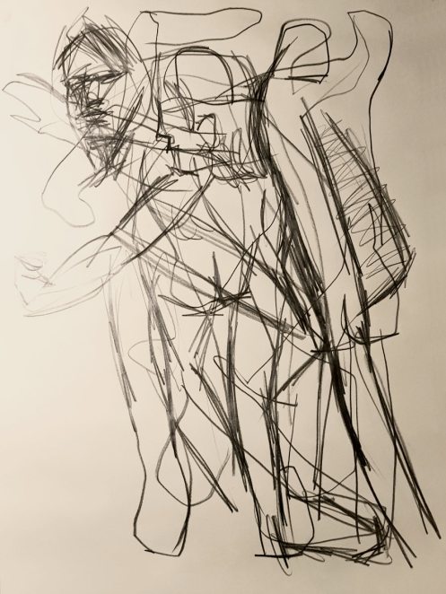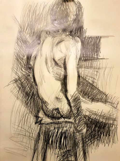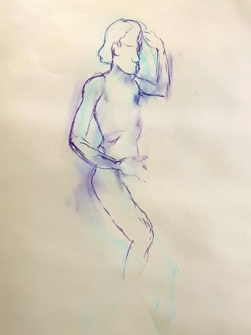 By the time they returned there was time for one more pose lasting 40-minutes. I was given leave to be seated, and the artists were free to draw in whatever way they liked. Simon restarted the dance-pop playlist that had been our accompaniment all evening, and continued to share friendly hints and tips. At the end, everybody stayed to review their work but, alas, I had to dash for a train. I was sad to go – it had been lots of fun.