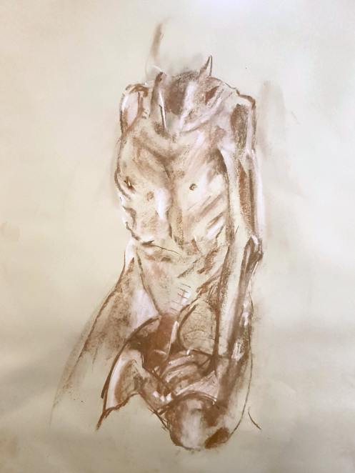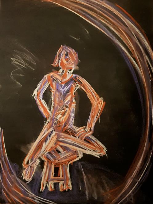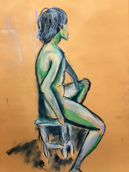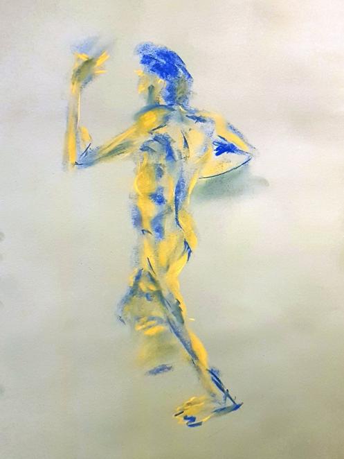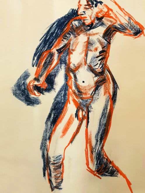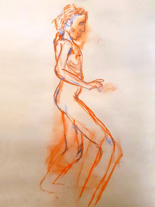 I enjoyed these unusual warm-up exercises and the personality that Simon brought to them. After what was a fairly dynamic start, the session settled into a 30-minute pose taking us to a break. I stood with a forward stride and one arm raised while each artist used just two coloured pastels to capture the stance. Half an hour later, with fine work created, they all decamped to the bar for some well-earned refreshment.