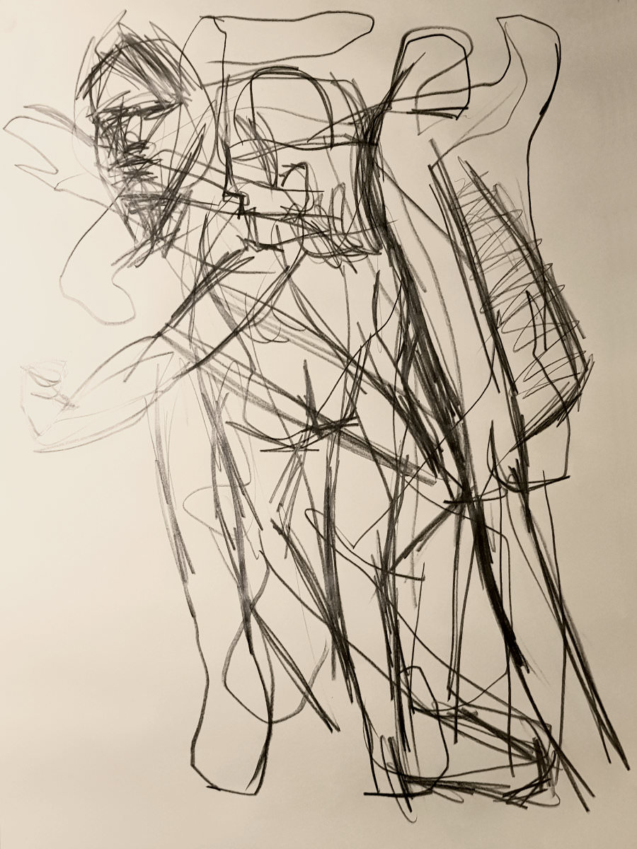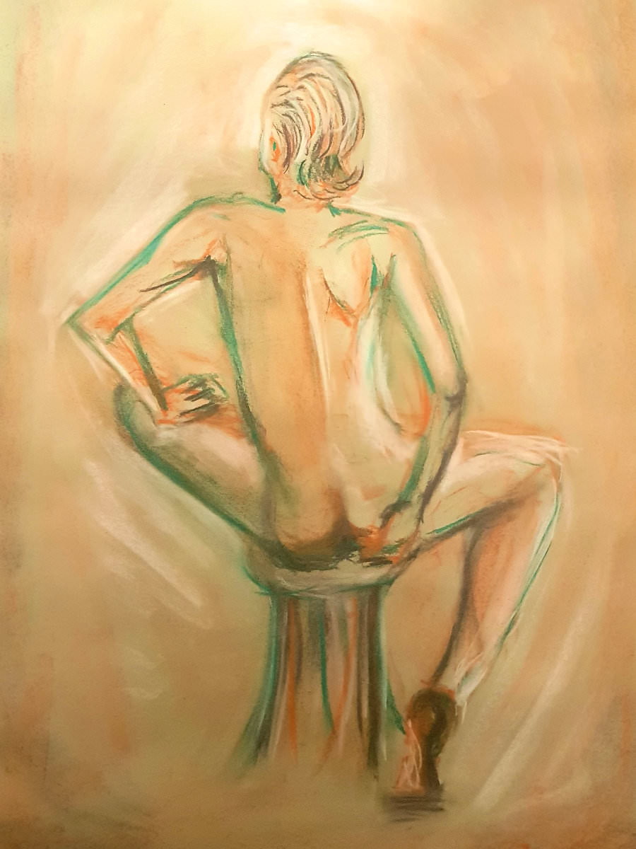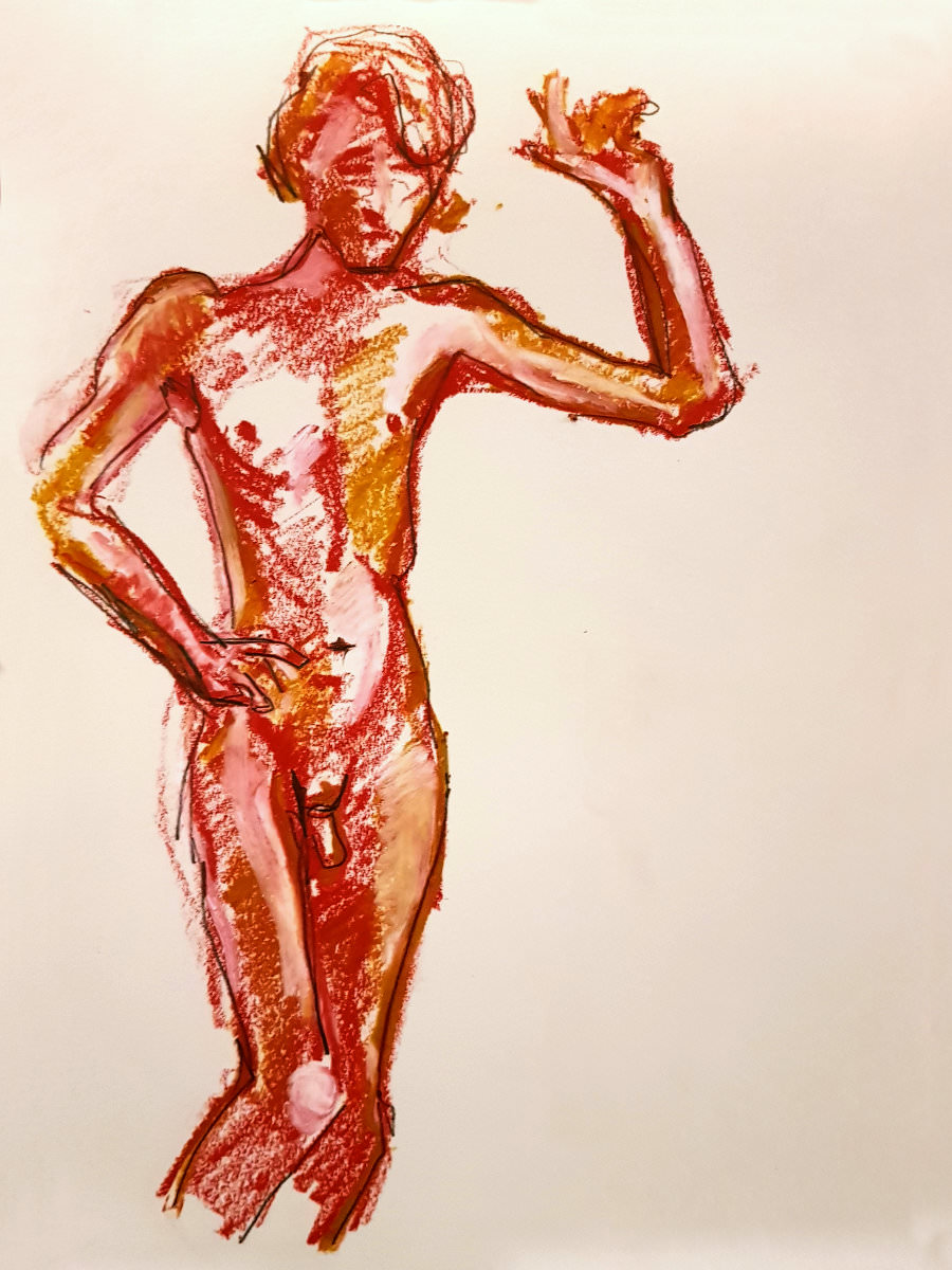 I enjoyed these unusual warm-up exercises and the personality that Simon brought to them. After what was a fairly dynamic start, the session settled into a 30-minute pose taking us to a break. I stood with a forward stride and one arm raised while each artist used just two coloured pastels to capture the stance. Half an hour later, with fine work created, they all decamped to the bar for some well-earned refreshment.