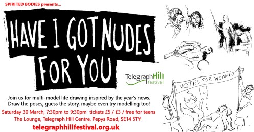 Telegraph Hill Festival celebrated its 25th year in 2019. When the festival organiser invited Esther to present a Spirited Bodies event she decided it was time for another ‘Have I Got Nudes For You‘ special. Much fun was had by all when we’d combined life drawing with topical news-inspired poses for the first time in December last year, and the craziness of humanity had provided us with plenty of fresh material since then.