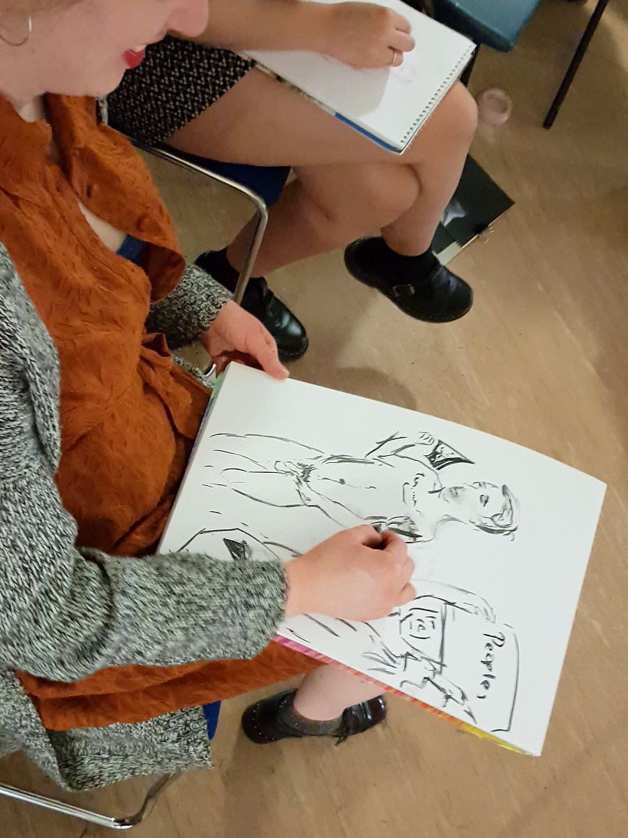 We tweaked the format a little. In the first half, Esther and I would recreate eight news stories and ask a quiz question about each one. Then in the second half Esther would create three group tableaux with volunteers from our audience of artists, after which a quiz champion would be announced and crowned for the final pose of the session. An unexpected bonus was a party group joining in the fun to celebrate a birthday.