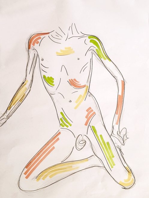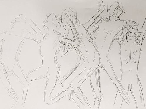 I felt happy with this new closing pose and even more delighted when I saw the way it had been captured on paper. As always, artworks were placed on the floor for general admiration at the end of the evening. If I had to choose a favourite, it was possibly the work below by organiser Annie: a colourful collection of body parts from all the poses, but with special attention to hands. Uniquely exquisite. A highly pleasing session.