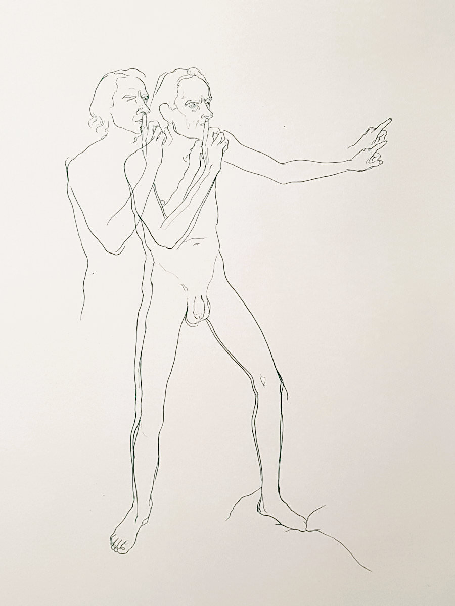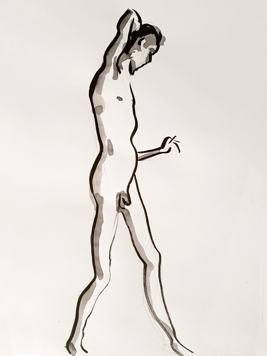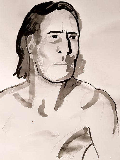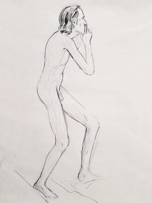 We opened with the customary warm-up sequence of five 1-minute poses. I assumed we would probably follow these with a five or ten minute pose so I had it in mind to do my shushing pose with one finger to my lips and the other arm extended. When I was asked for a 15-minute pose instead, I stuck with my plan but the extra minutes took a toll on my extended arm. I sat down for half an hour after that.