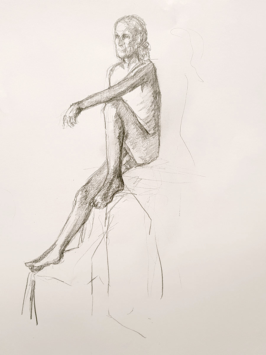 Up to this point I’d been posing in front of a dormant fireplace whilst the artists sat in a semicircle around me. For our final 30-minute pose of the evening, however, I decided to perch on the mantelpiece and have my legs supported by a chair: one foot down on the base and the other propped upon its back. For added good measure, I draped one arm across the higher knee.