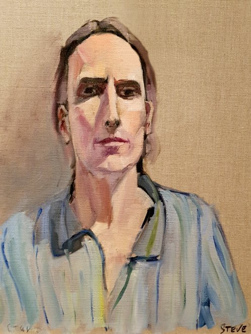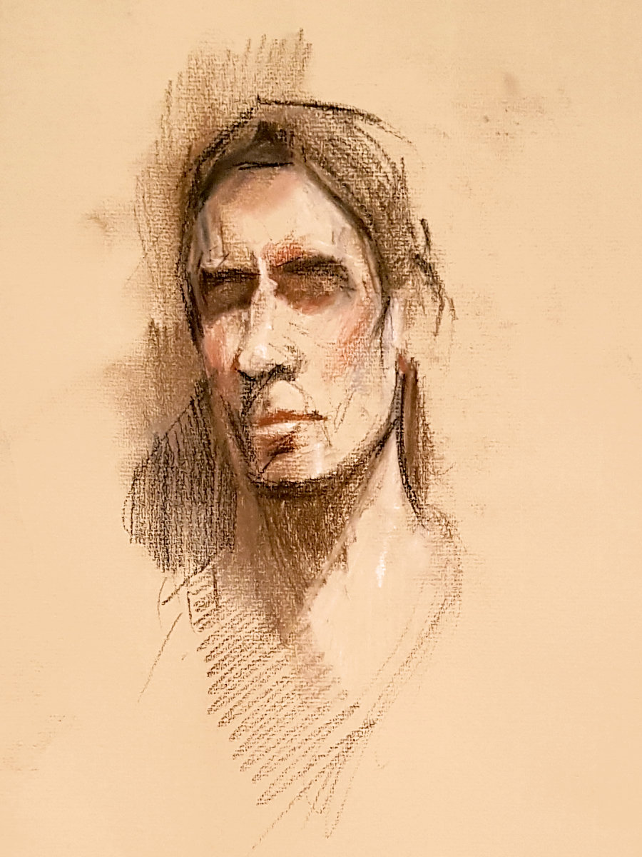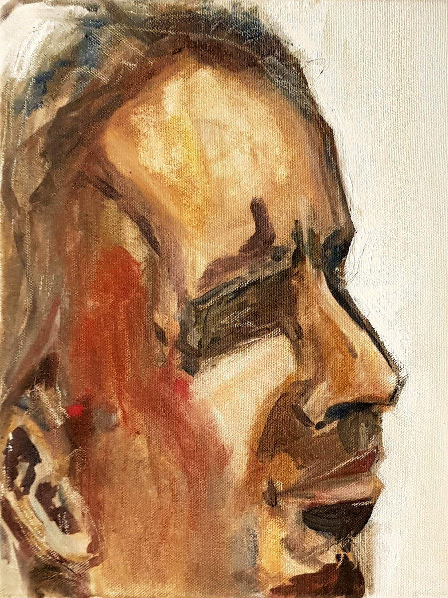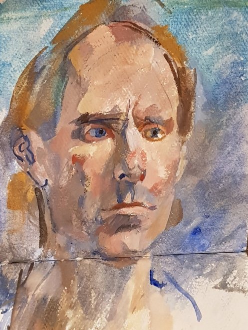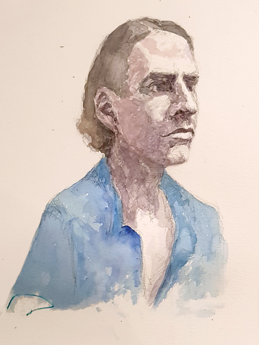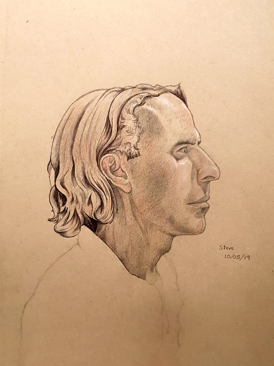 Sometimes portrait sitting can be a drowsy business, but I felt rather alert throughout this one. Within each hour, milestones were marked by the distant calls for Tatiana to change position every quarter. Time passed smoothly, with some nice artworks being the result – all quite different, yet each one somehow me. A pleasing session.