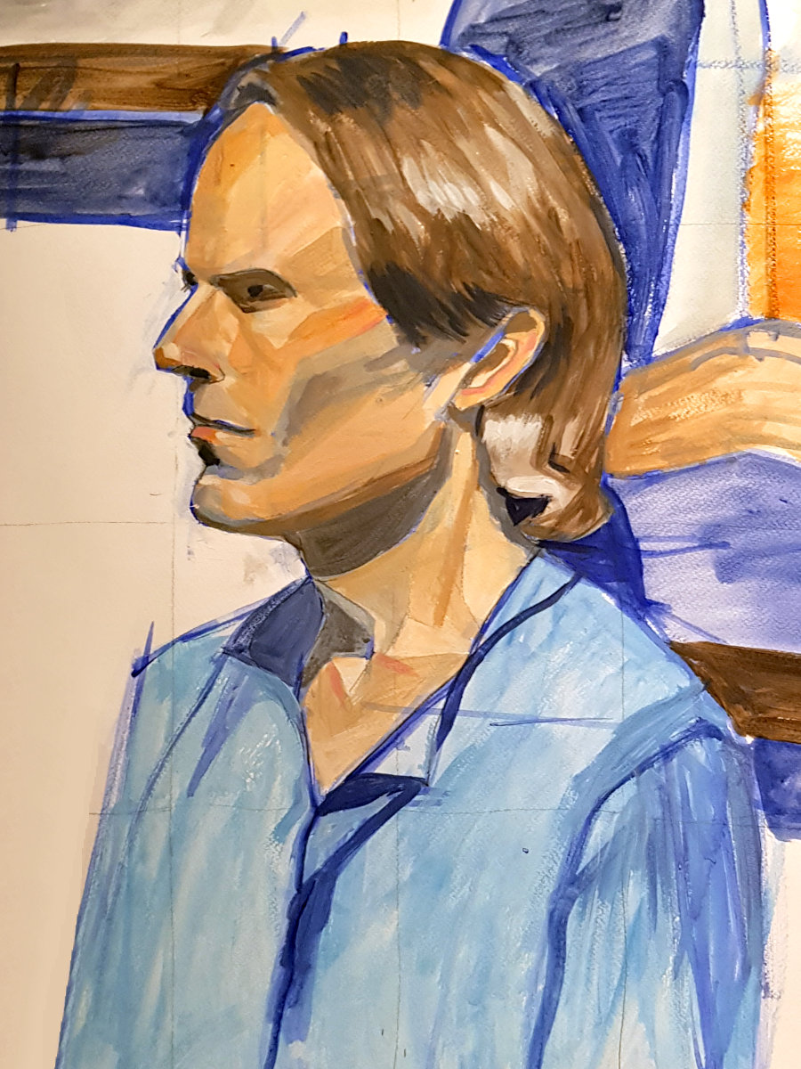 This booking, my first for portraits at Mall Galleries since September last year, fell to me only the day before. Hesketh president, Simon had sent a reminder text message to his original model and found she had made other plans. Tatiana shared his call-out and into the breach I duly stepped… or rather, sat.