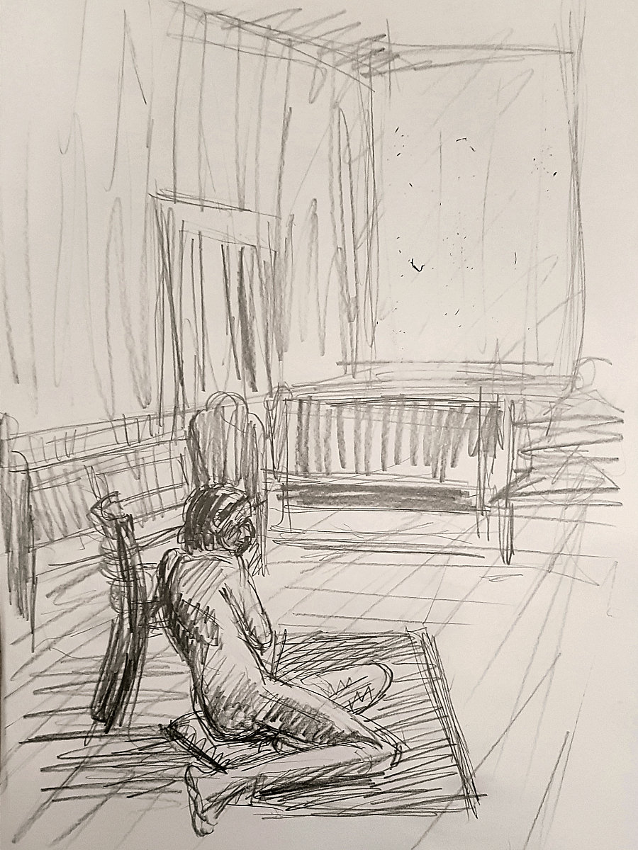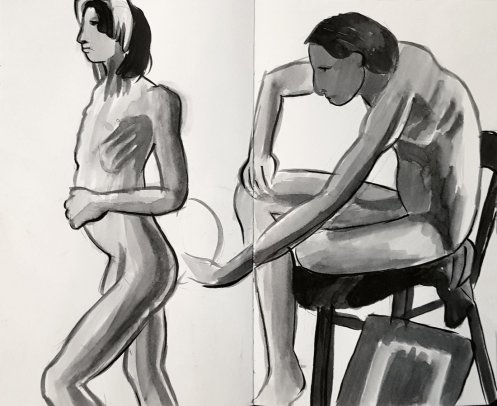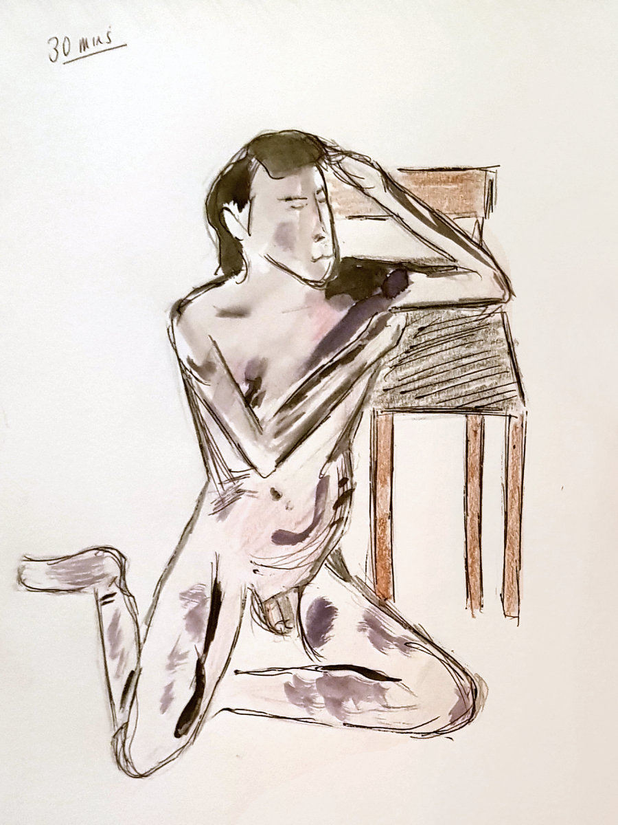 As absentees presumably frolicked outdoors in the long light mellow evening air, I set about presenting my best shapes to the dedicated handful who’d paid to draw. Poses were timed at 10-minutes, 2, 2, 2, 5, 5, 15 and 15-minutes during the first half. After a half-hour break, we completed the session with two poses of 30-minutes each. First I sat on a chair, contemplating a balloon, then ended in angles, seated on the floor.