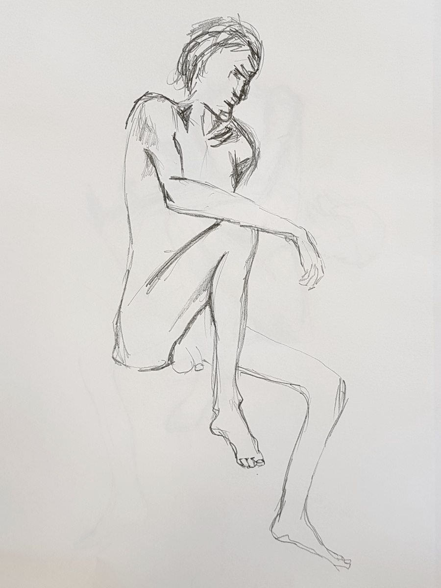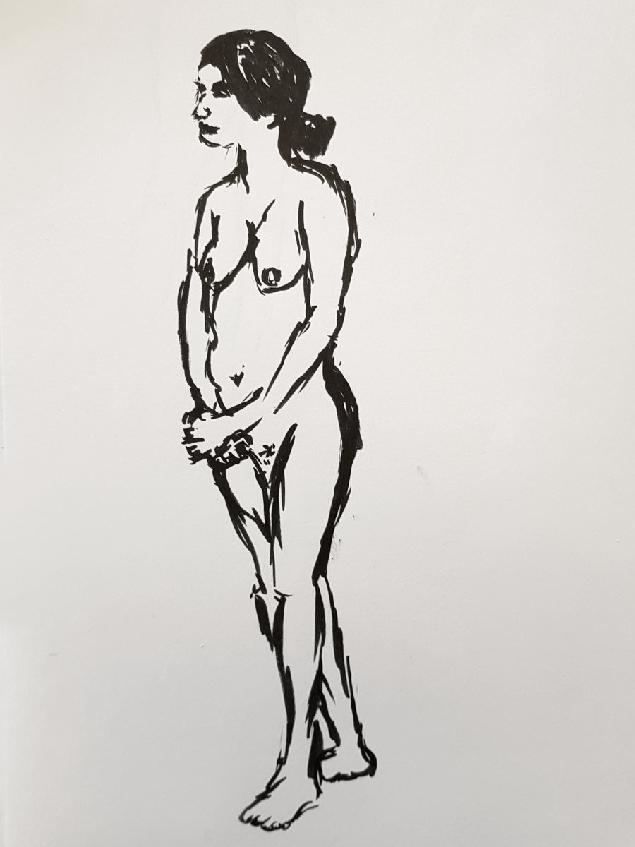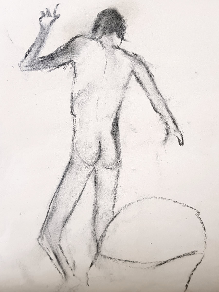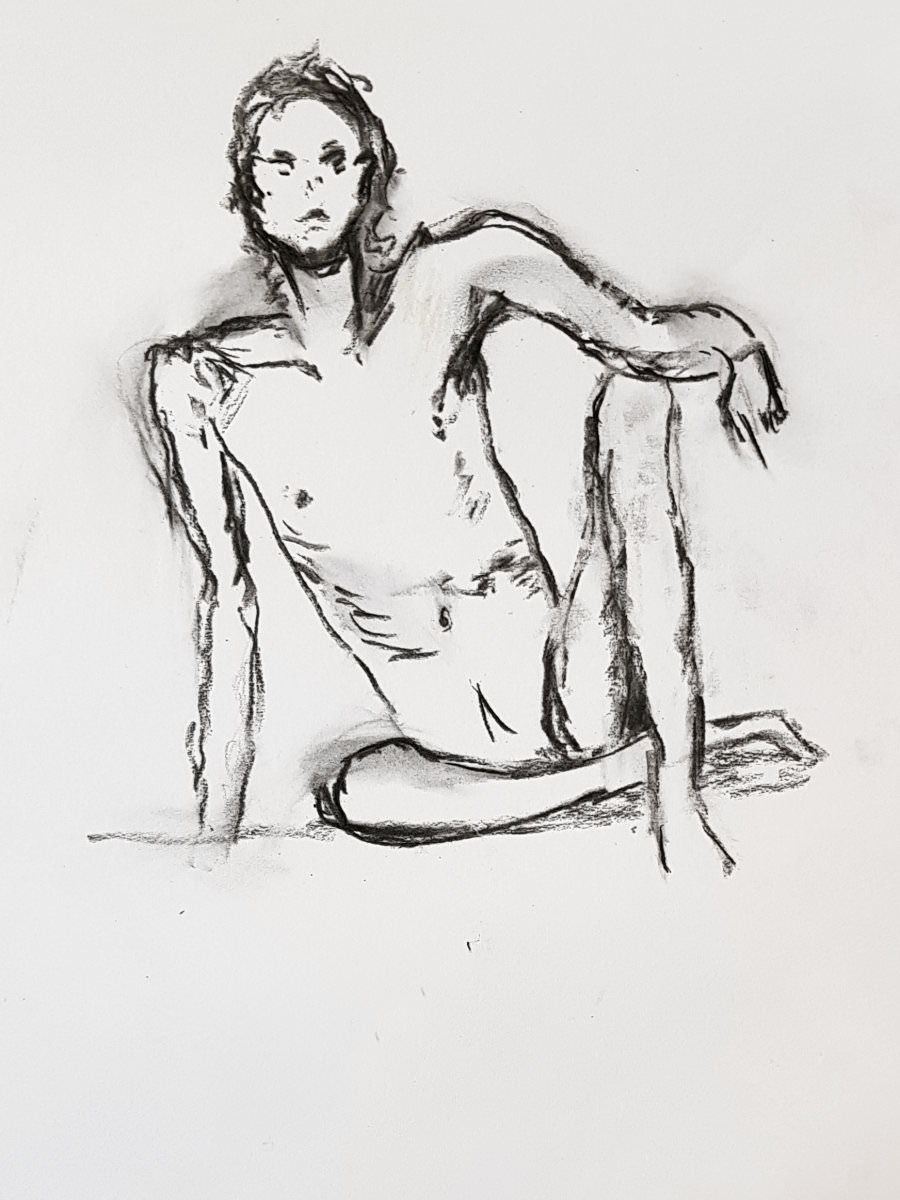 West Horndon Art Group meets at West Horndon Village Hall in the parish village of West Horndon. Once a year they organise a life drawing morning with one female model and one male model. Natansky lives just one town over, so is very convenient as their female model. I’m three towns over, and this year got the nod as their male.