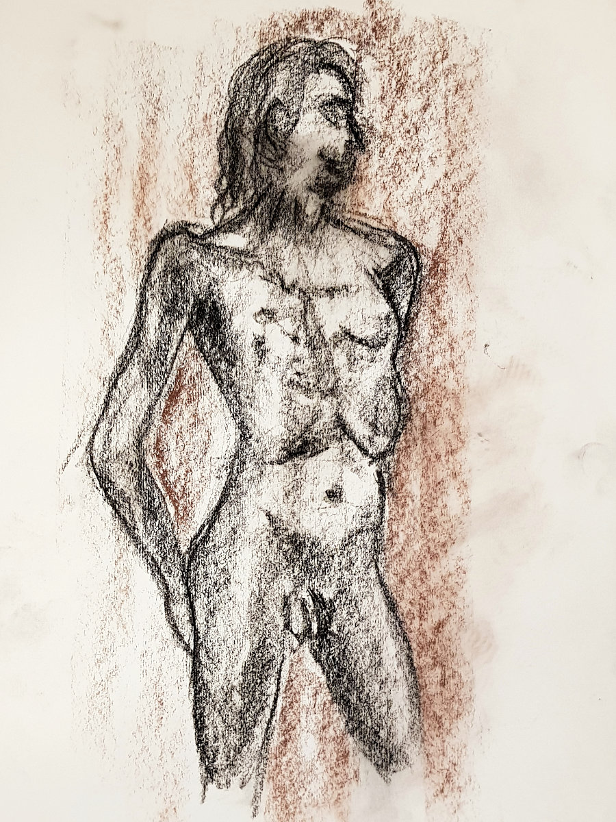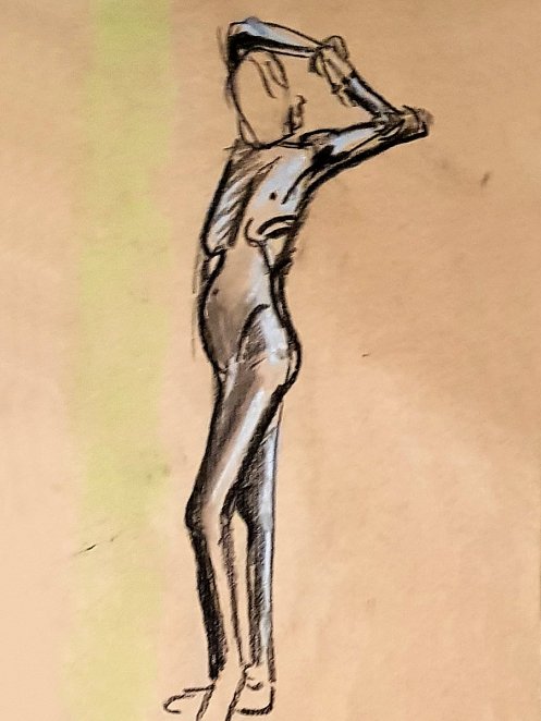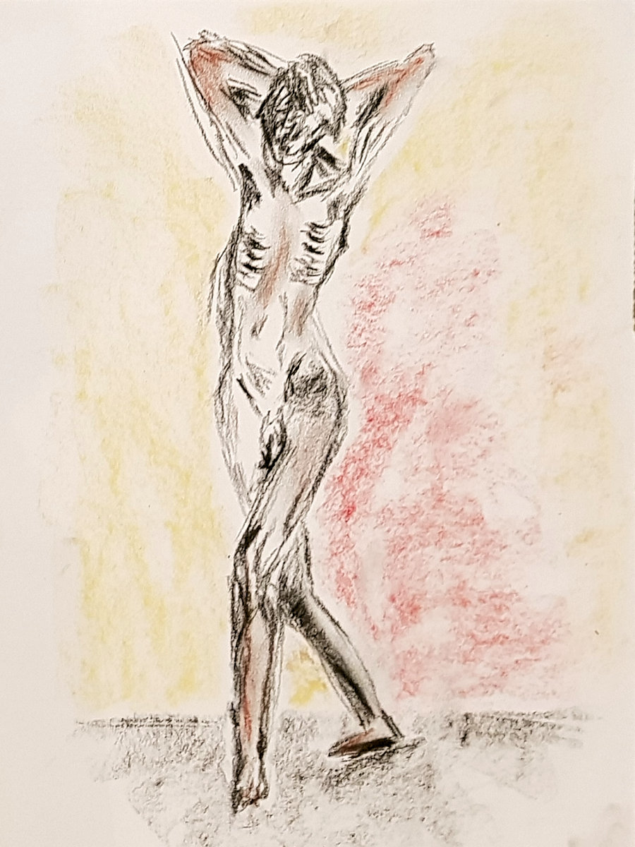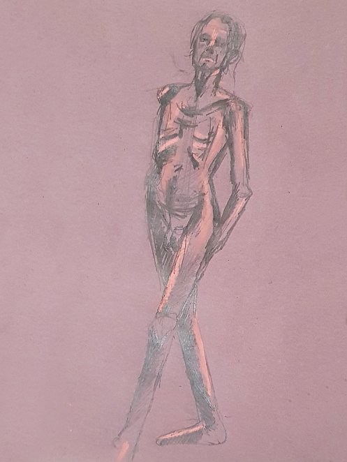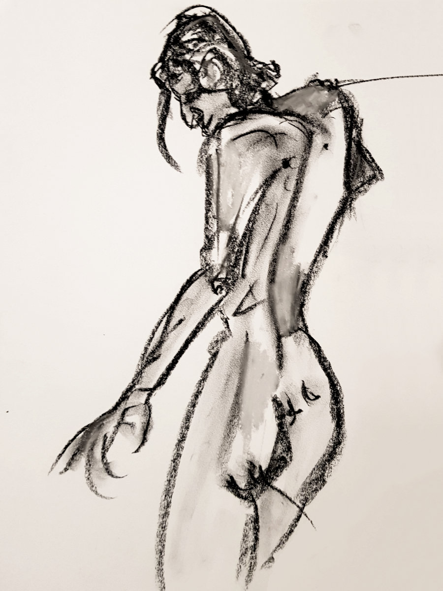 One thing that never alters is the warm welcome from head cave-dweller, Karen. She looks after her models and artists with equal attentiveness, always bringing a positive energy to the occasion. Having fired-up the group, she then gets us started with short dynamic work: five 1-minute poses, two 5-minute poses and two 10-minute poses, as Ladysmith Black Mambazo serenade us in style from the old CD player.