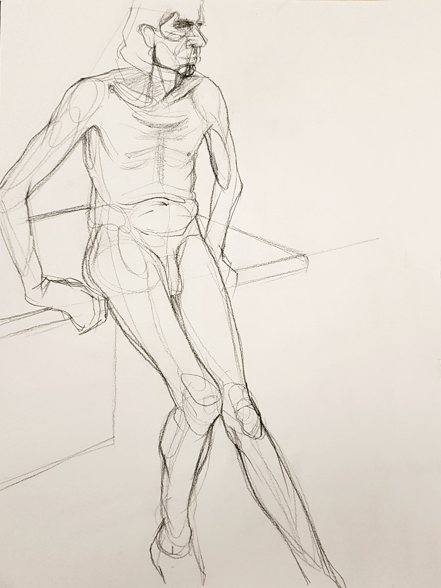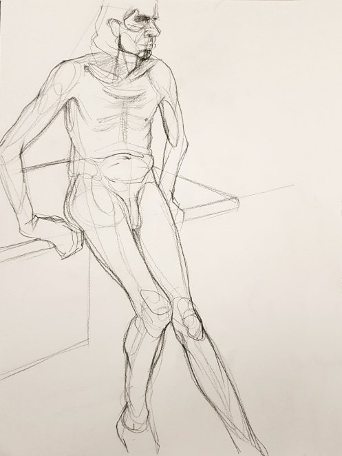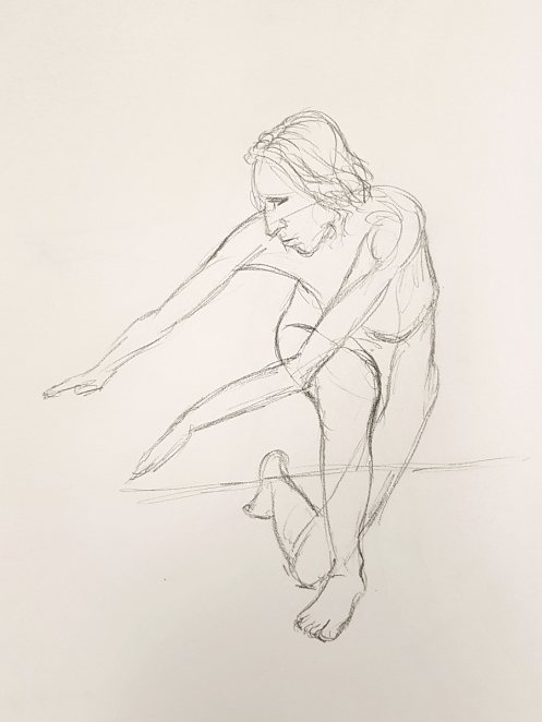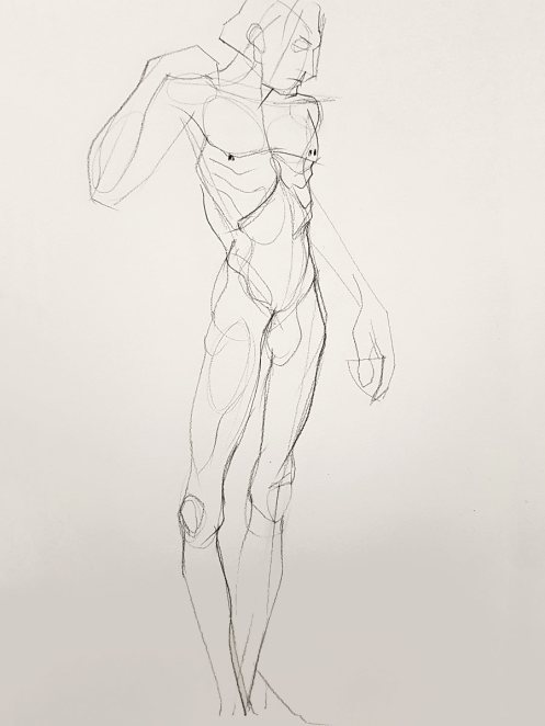 Insanely, I somehow overexerted a leg muscle during the second 5-minute pose and couldn’t prevent it fibrillating constantly up to the interval. No pain, just disconcerting. For the final 40-minutes I propped myself on the edge of a table – a simple pose that resulted in some wonderful artworks. Increasingly I realise simplicity is the way to go!