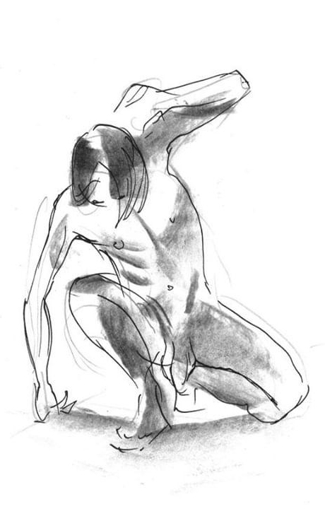 On my last visit to the Royal Inn on the Park I had the dubious honour of modelling for the venue’s lowest ever life drawing attendance. It was a relief, therefore, to find a larger gathering – albeit only slightly – was already in situ when I arrived this evening. Mentally, I came up with a pose plan to suit these artists arranged in a horseshoe arc around me. I started with a 10-minute pose… but then more people started to arrive.