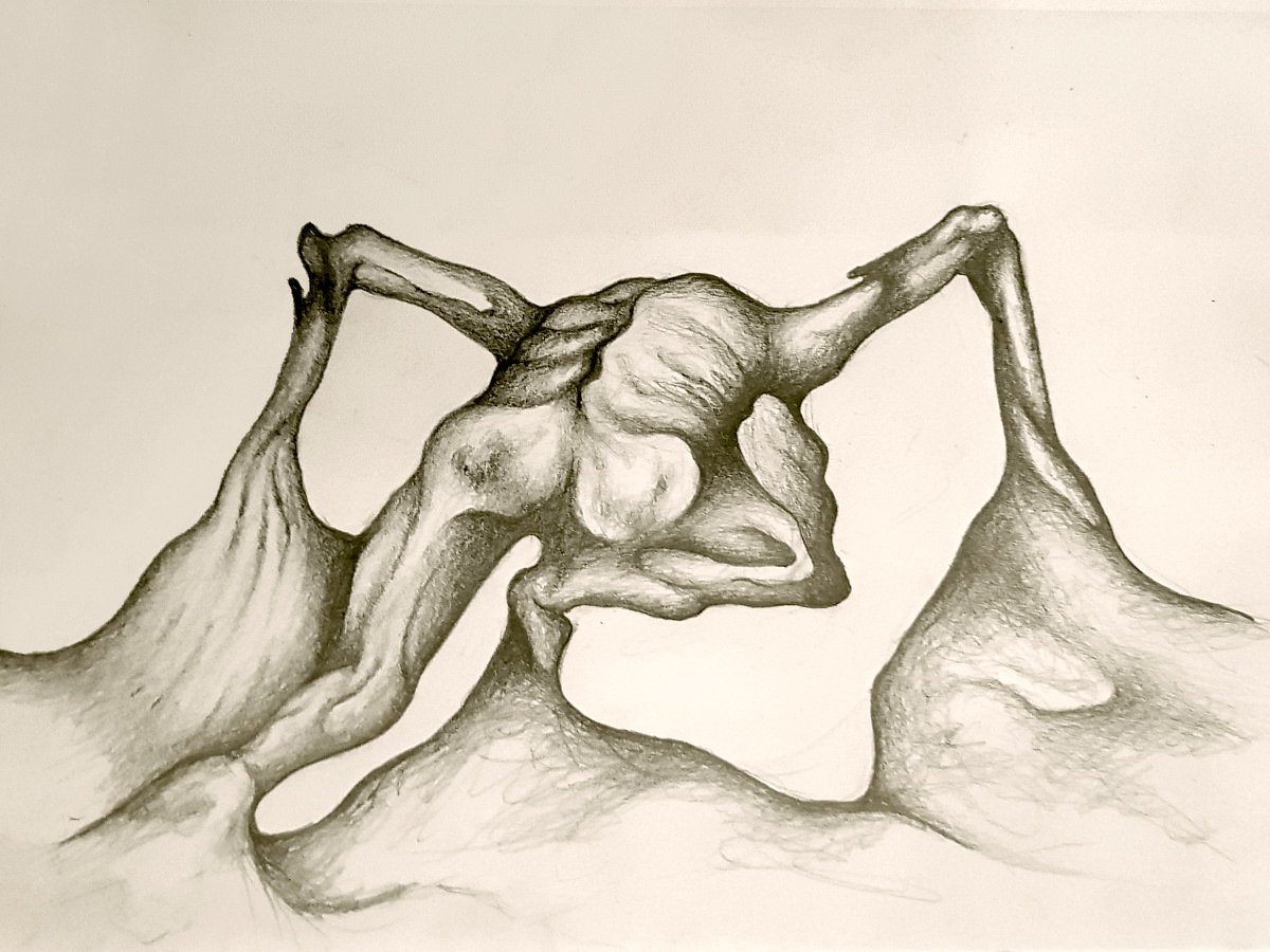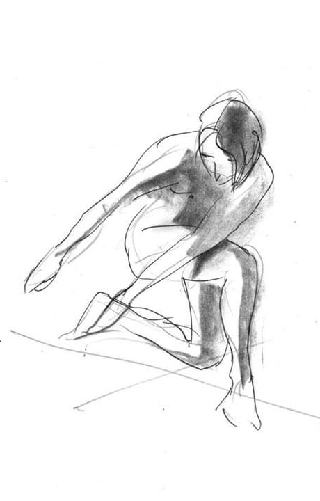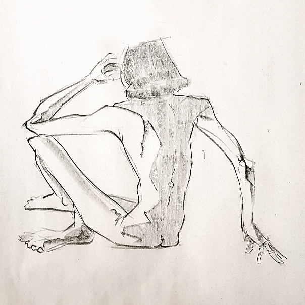 The broad rectangular room was full by the time my first pose came to its end. Artists lined the long edges in front of me and behind me, and each end. Clearly I needed to reconsider my pose plan. I pushed my stage – a sheet on a yoga mat – into a central position and resumed with a rotation of poses in the round: three of 2-minutes, two of 5-minutes and two of 15-minutes, taking us up to half-time.