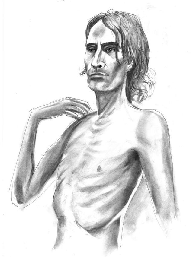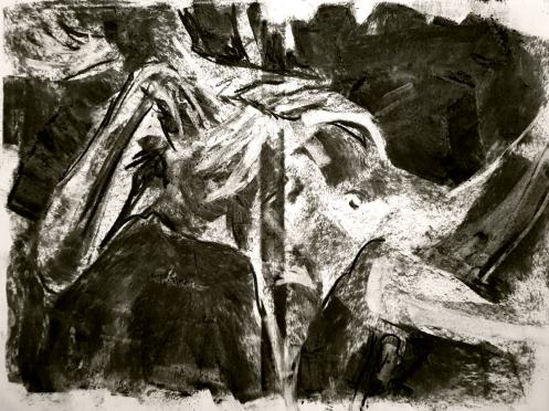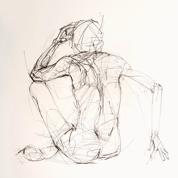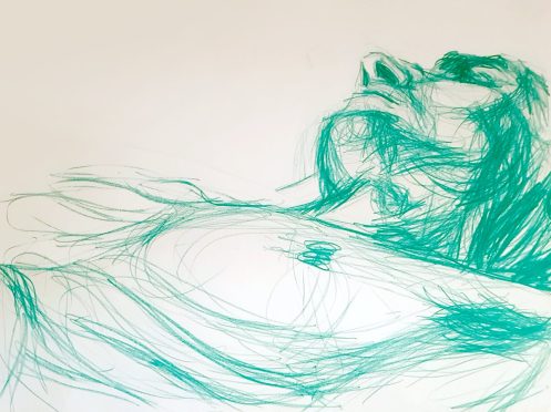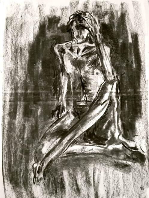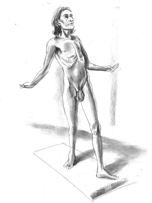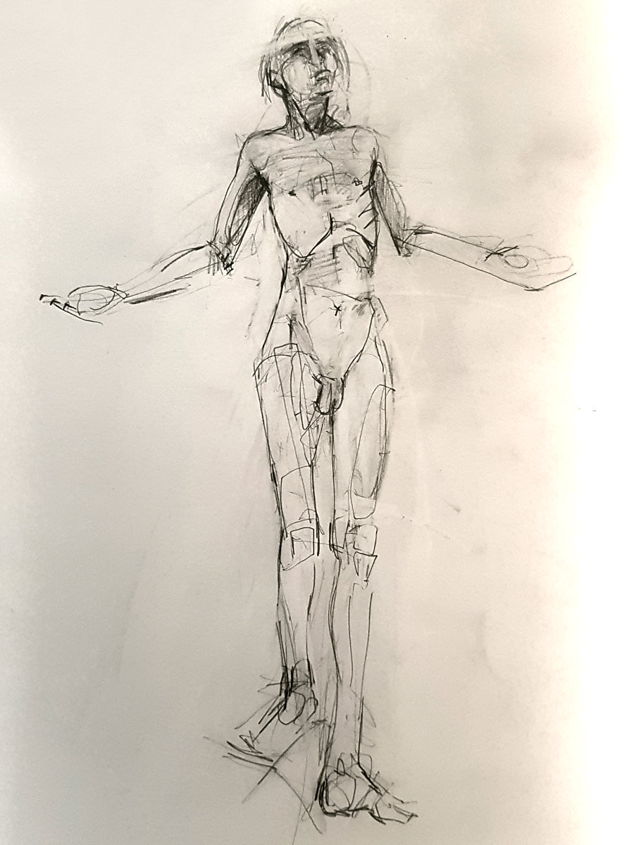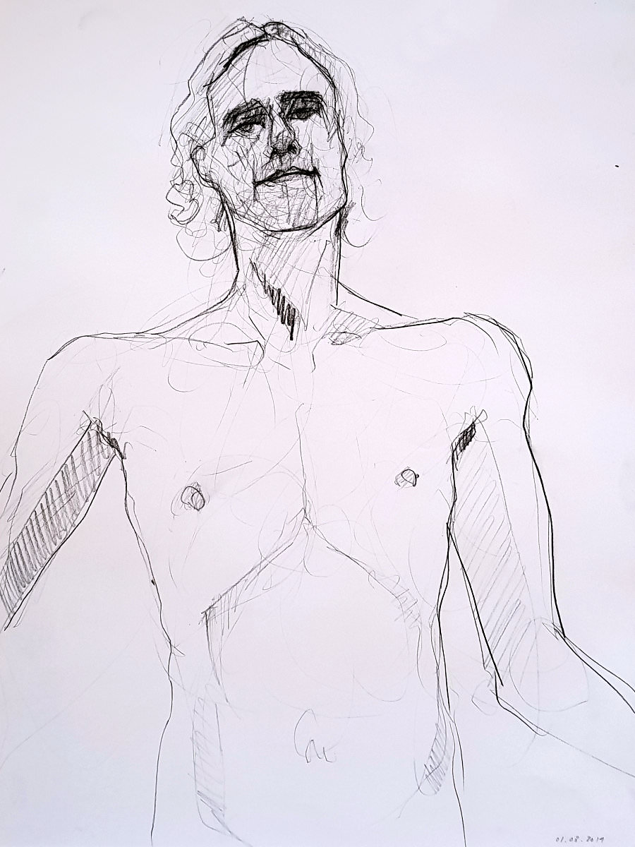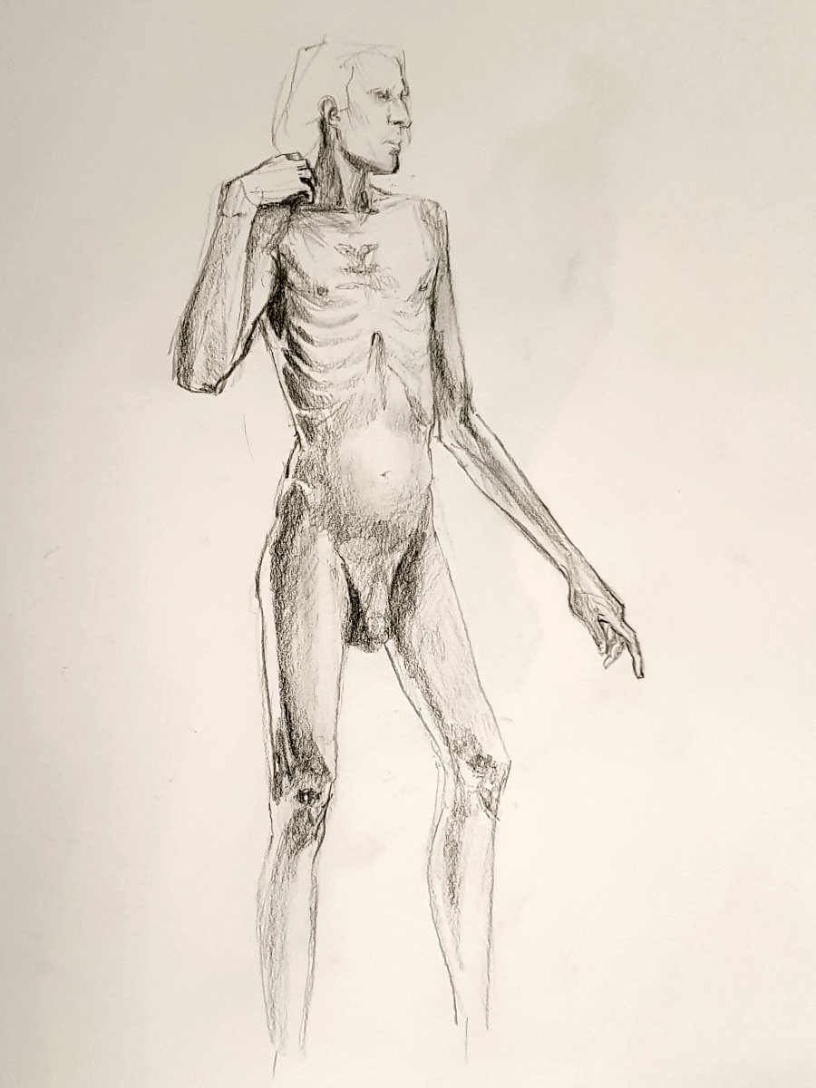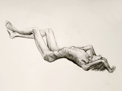 Two 30-minute poses completed the second hour of our session. For the last, I lay on my back with my feet up on the table that originally I planned to sit upon with my back to the wall. Such was the evolution of my revolution; also it offered an equitable range of interesting sight lines to everyone present. It was great to be life modelling for a full house – always special in one of Adrian and Mark’s London Life Drawing groups.