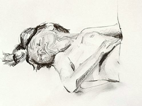 Before our hefty meal, while still fairly sleek, we’d opened with two poses of 5-minutes (me bespectacled), two of 10-minutes, then 15-minutes (a bit painful with me standing in a slightly leaning twist) and 14-minutes. Comfort was vital for the second half as we would be in pose for up to 60-minutes. Esther lay down and I sat beside her.