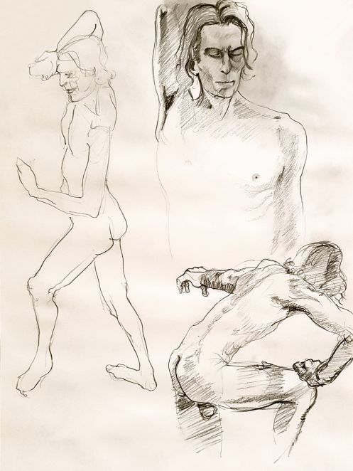I would be posing in the round for nigh on a dozen association artists – all friendly and welcoming folk. We opened with short dynamic poses: 5-minutes standing followed by 10-minutes down on one knee with my left arm outstretched. Next I was upright again, this time for 25-minutes, taking us to a break. Tea and Bourbons were served.