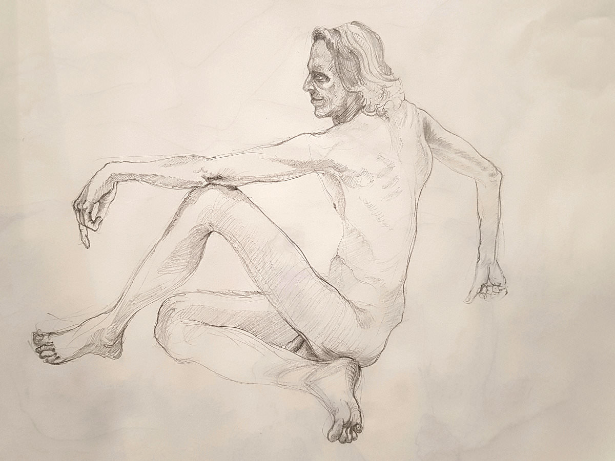 I would be posing in the round for nigh on a dozen association artists – all friendly and welcoming folk. We opened with short dynamic poses: 5-minutes standing followed by 10-minutes down on one knee with my left arm outstretched. Next I was upright again, this time for 25-minutes, taking us to a break. Tea and Bourbons were served.