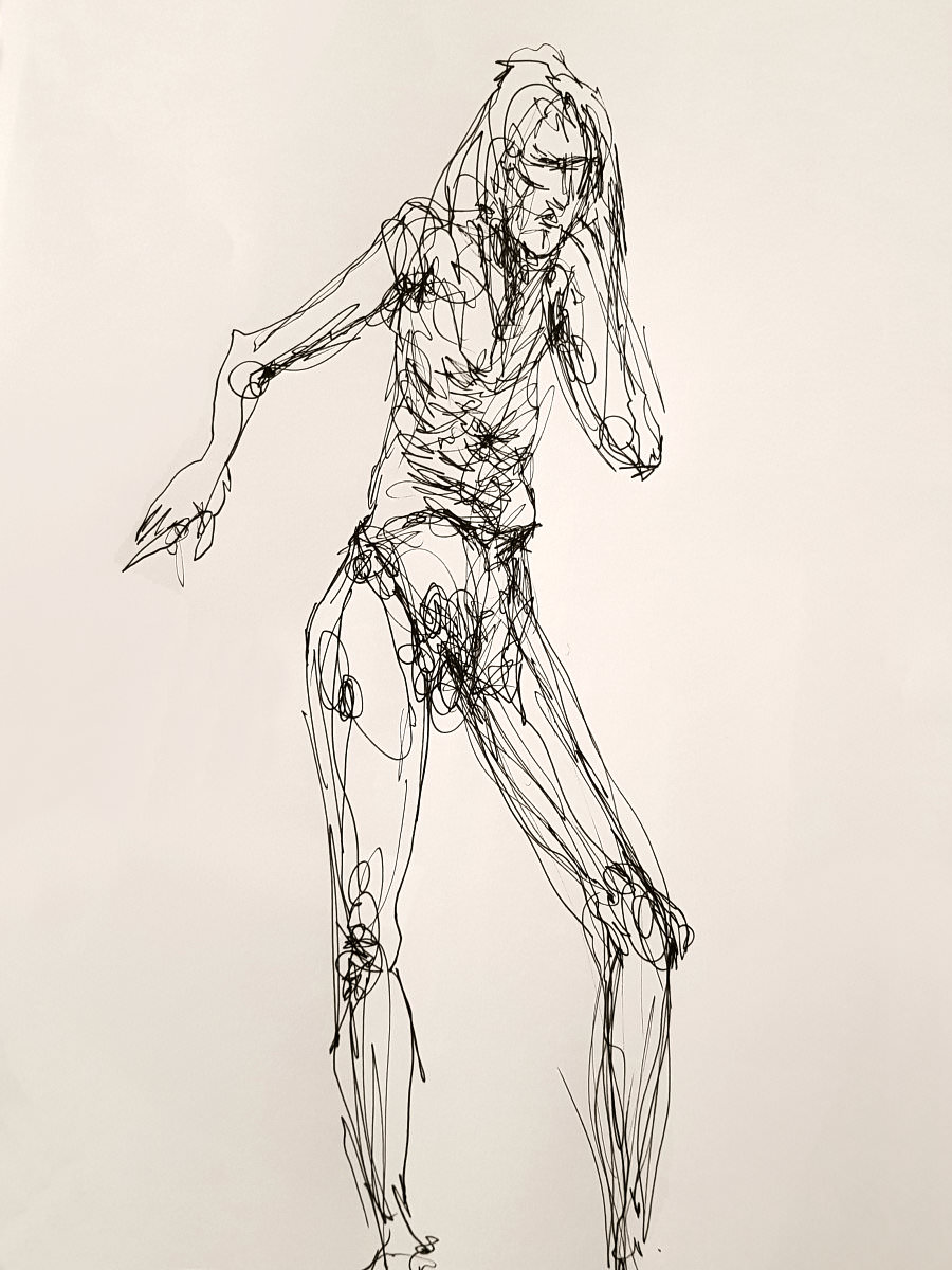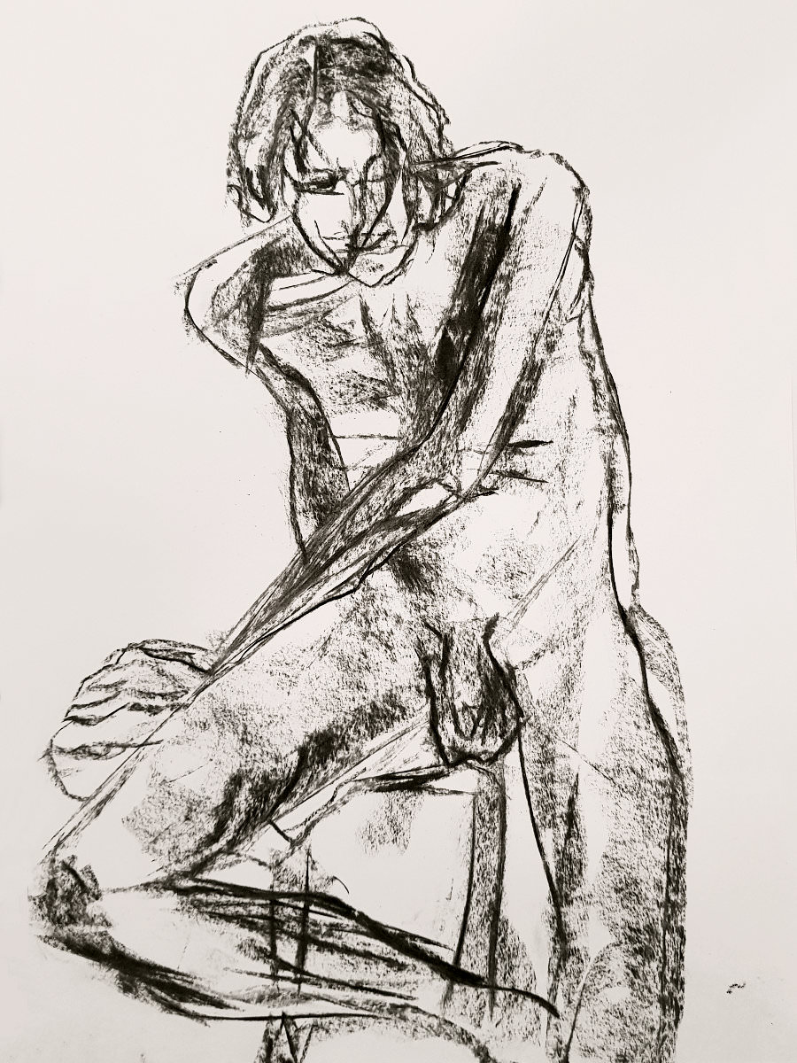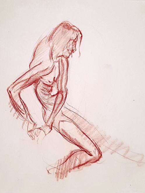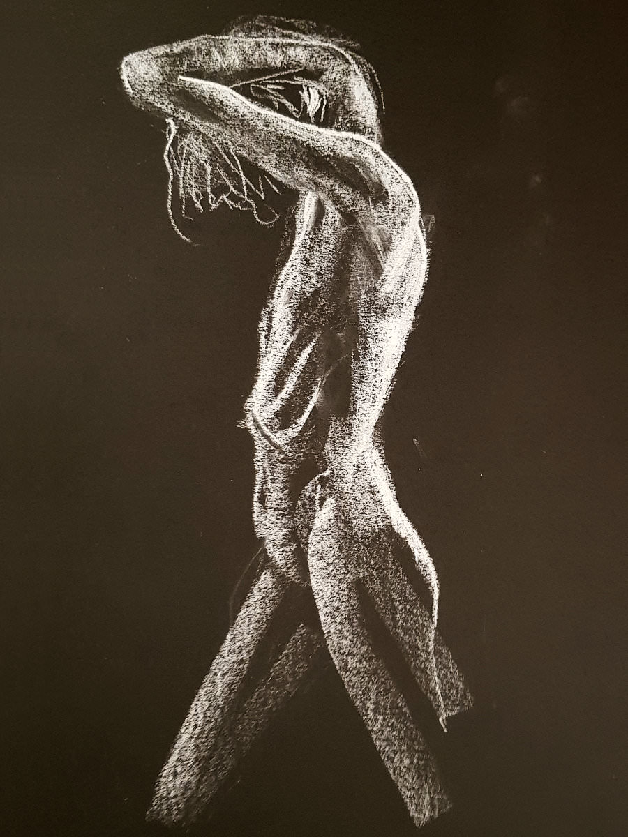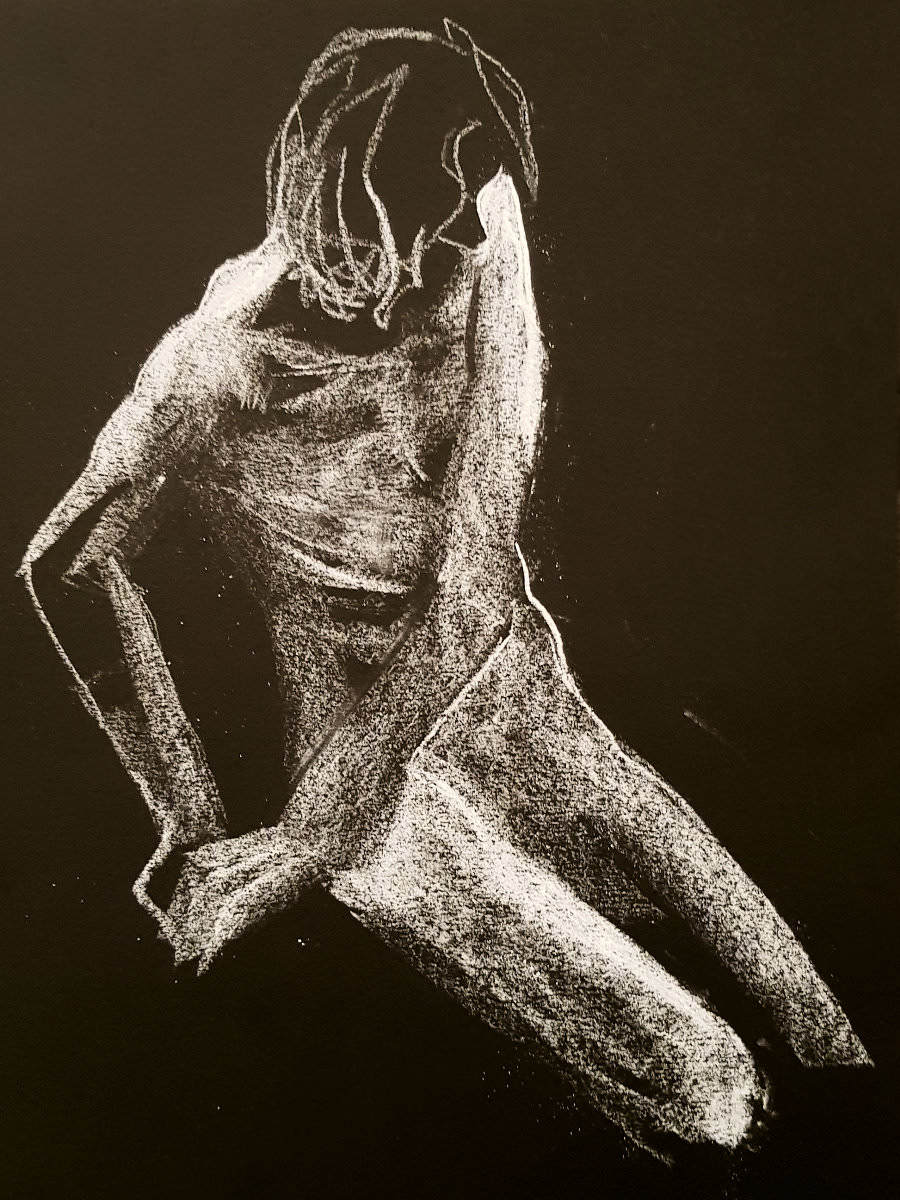 This was the fourth time I had modelled at The Star by Hackney Downs for Drawing the Star in 2019, so I was making a point to try new pose variations that I hadn’t used here before. Next, 10-minutes seated with a straight leg and both hands to one side.