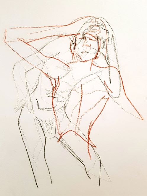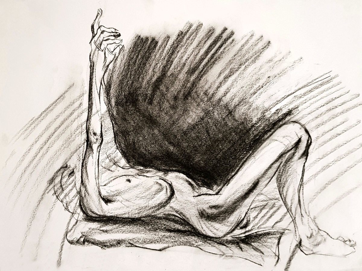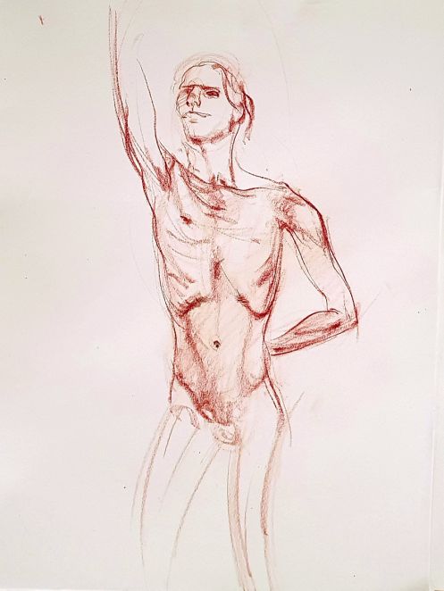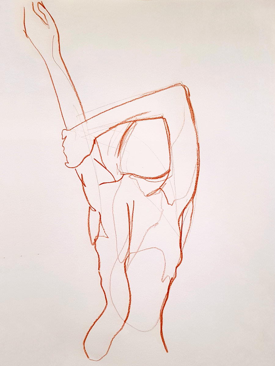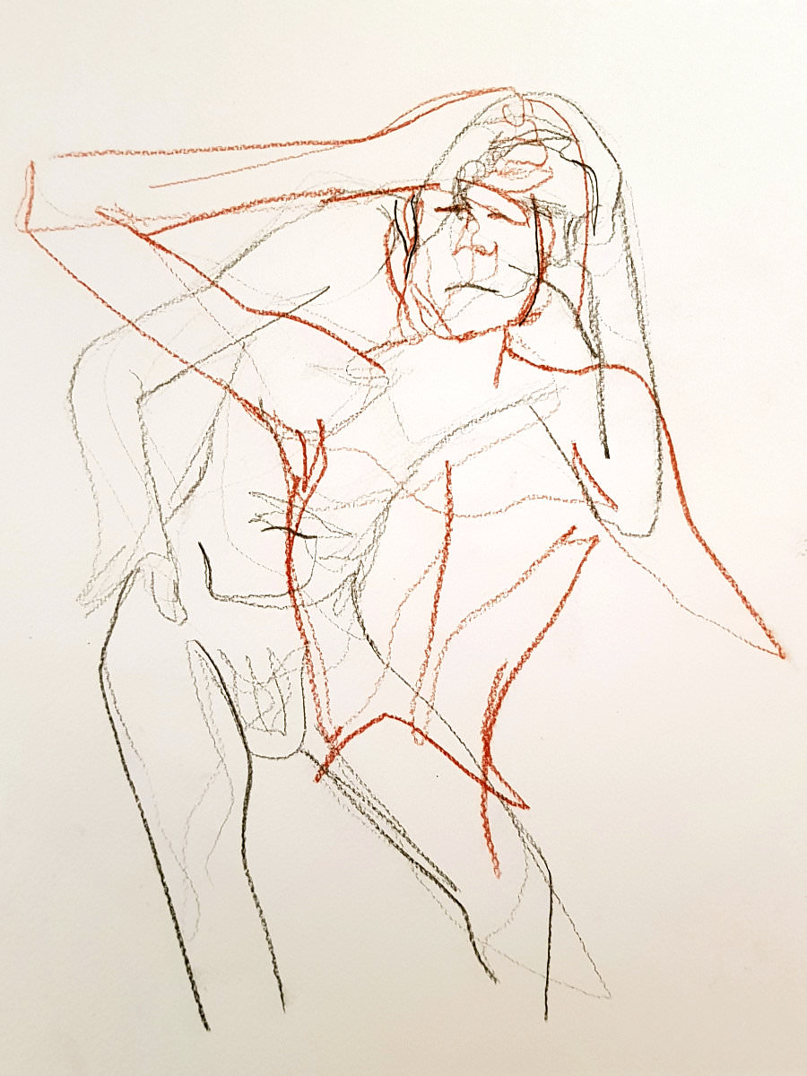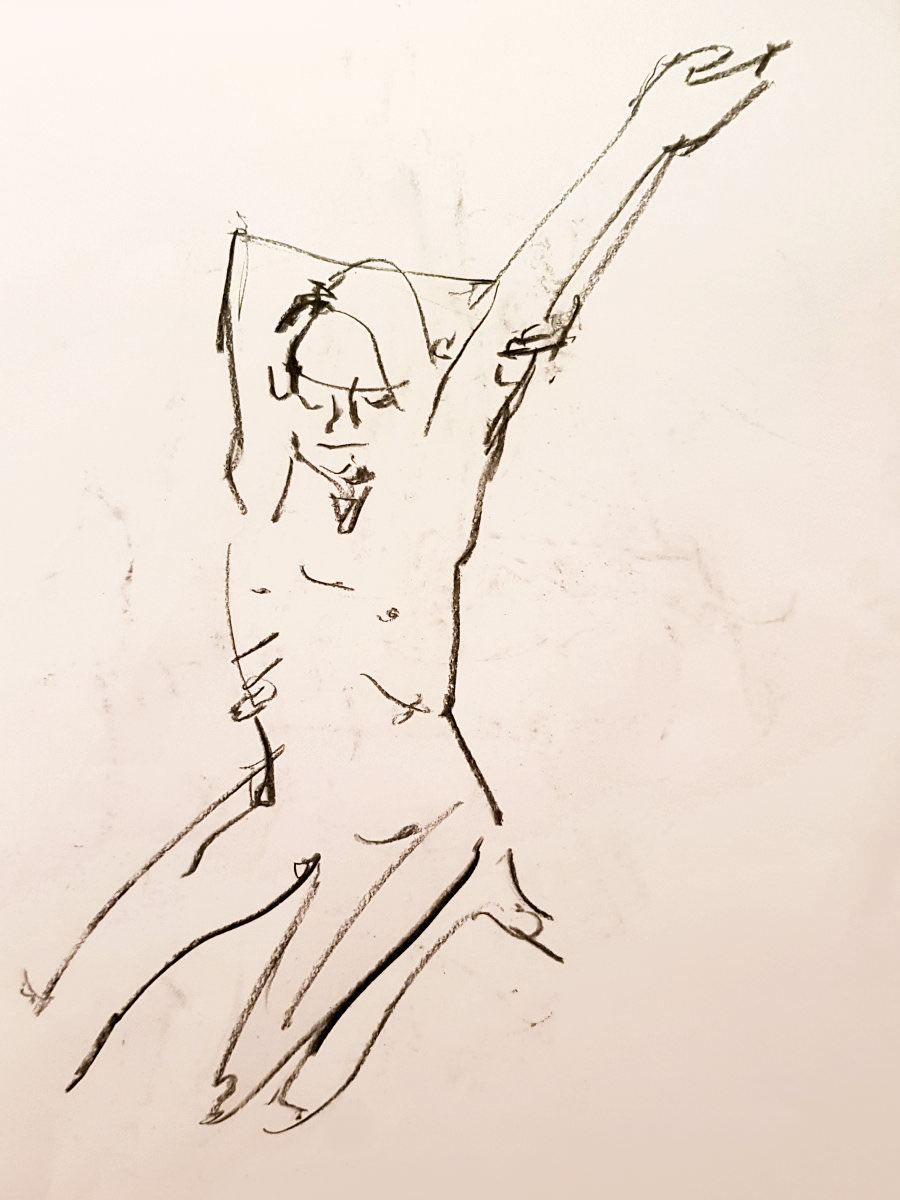 To begin the second half I lay upon the floor with one arm stretched directly upright for 15-minutes, then concluded the session standing with one knee resting on a stool and a hand behind my neck – both new poses, doubtless destined to be used elsewhere.