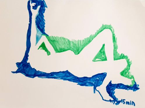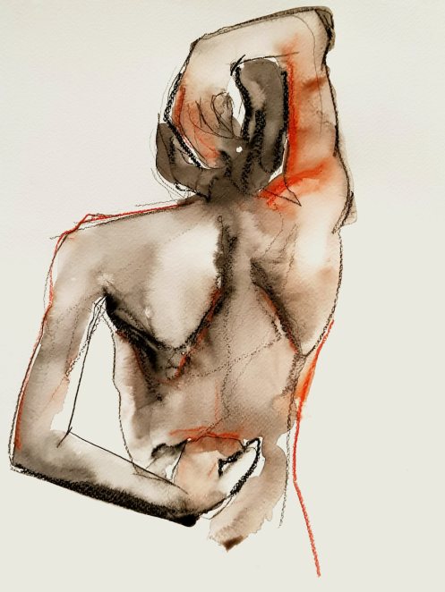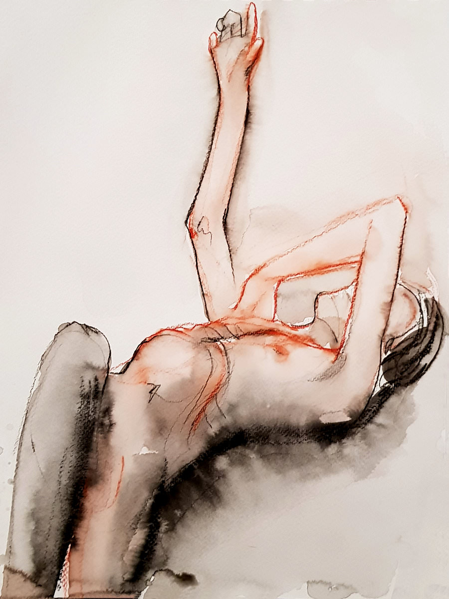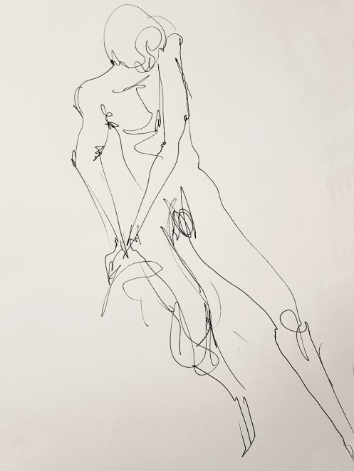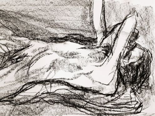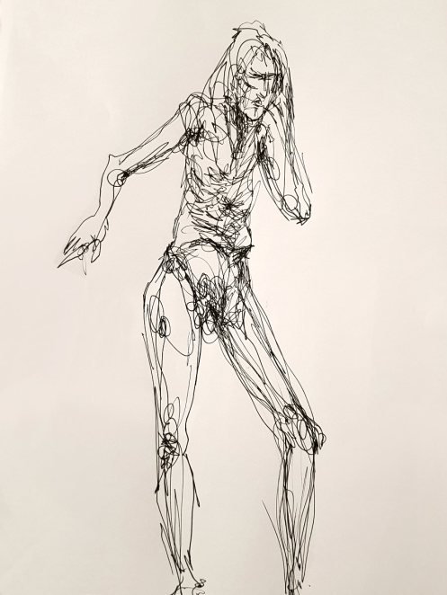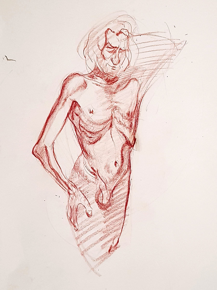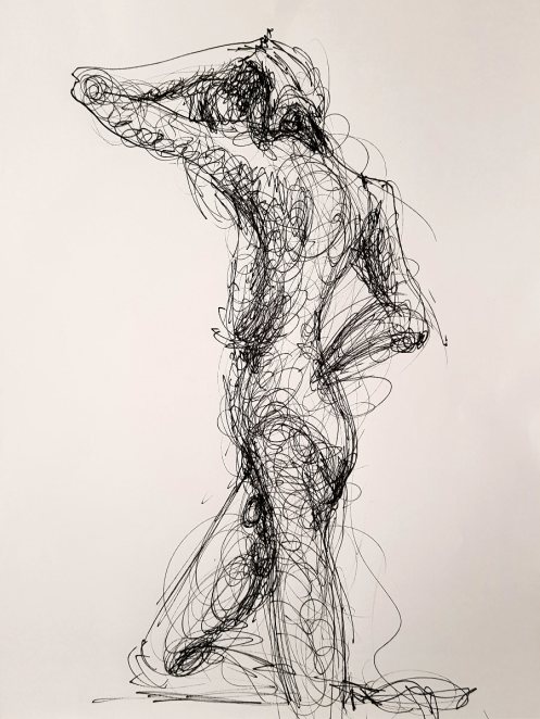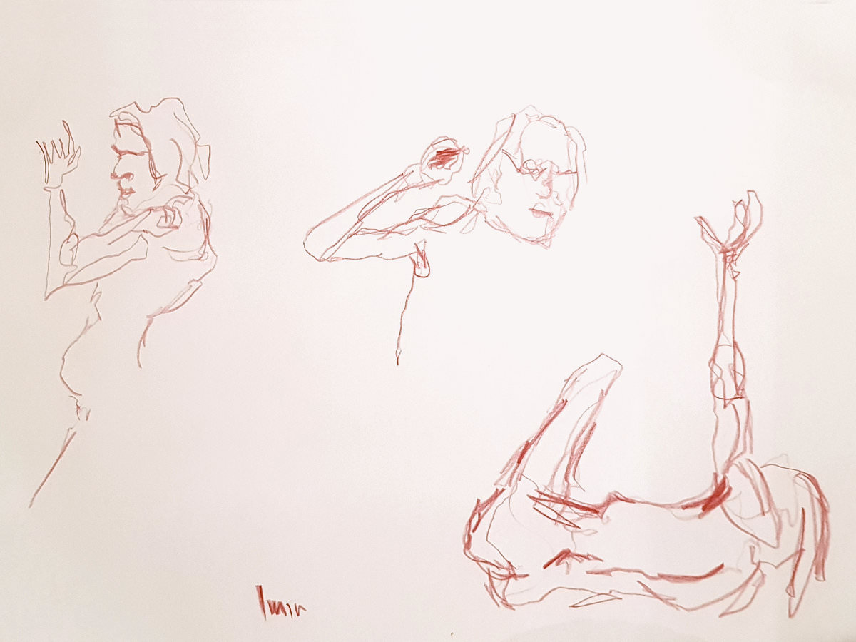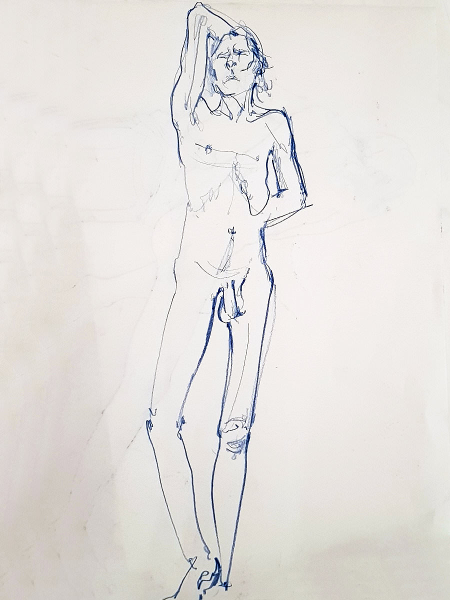 To begin the second half I lay upon the floor with one arm stretched directly upright for 15-minutes, then concluded the session standing with one knee resting on a stool and a hand behind my neck – both new poses, doubtless destined to be used elsewhere.