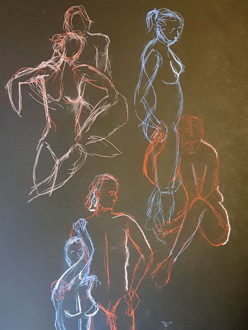 First time life modelling at any adult college – in this case Brockley Adult Education Centre – there’s only one thing truly certain: paperwork. No doubt it’s required by law rather than something they do for fun, but it meant that when Esther and I arrived for this duo session we needed our passports, bank details, National Insurance numbers and had to complete two sets of forms. Only then could we navigate to the art room…