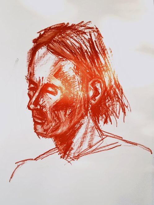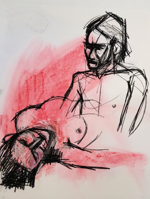 I’m never sure if it’s confidence, bravery, complacency or folly that motivates artists to attempt capturing two intertwined figures in just 60 seconds. Whatever the case here, it was done staggering well. The best I’ve ever seen for duo poses at such speed. We resumed with a 15-minute pose for which we were slightly apart, connected by gazing eyes and hand contact. A 45-minute reclining cuddle took us to the next break.