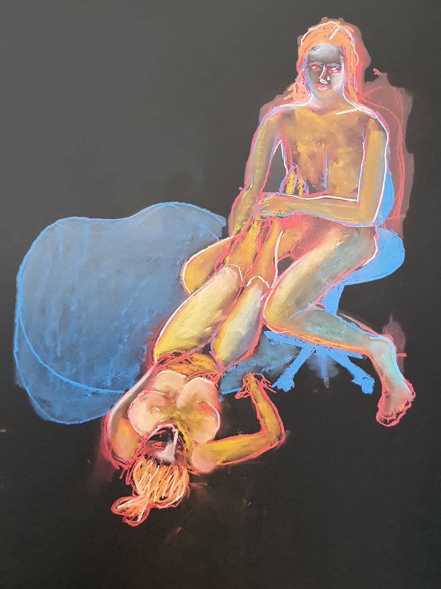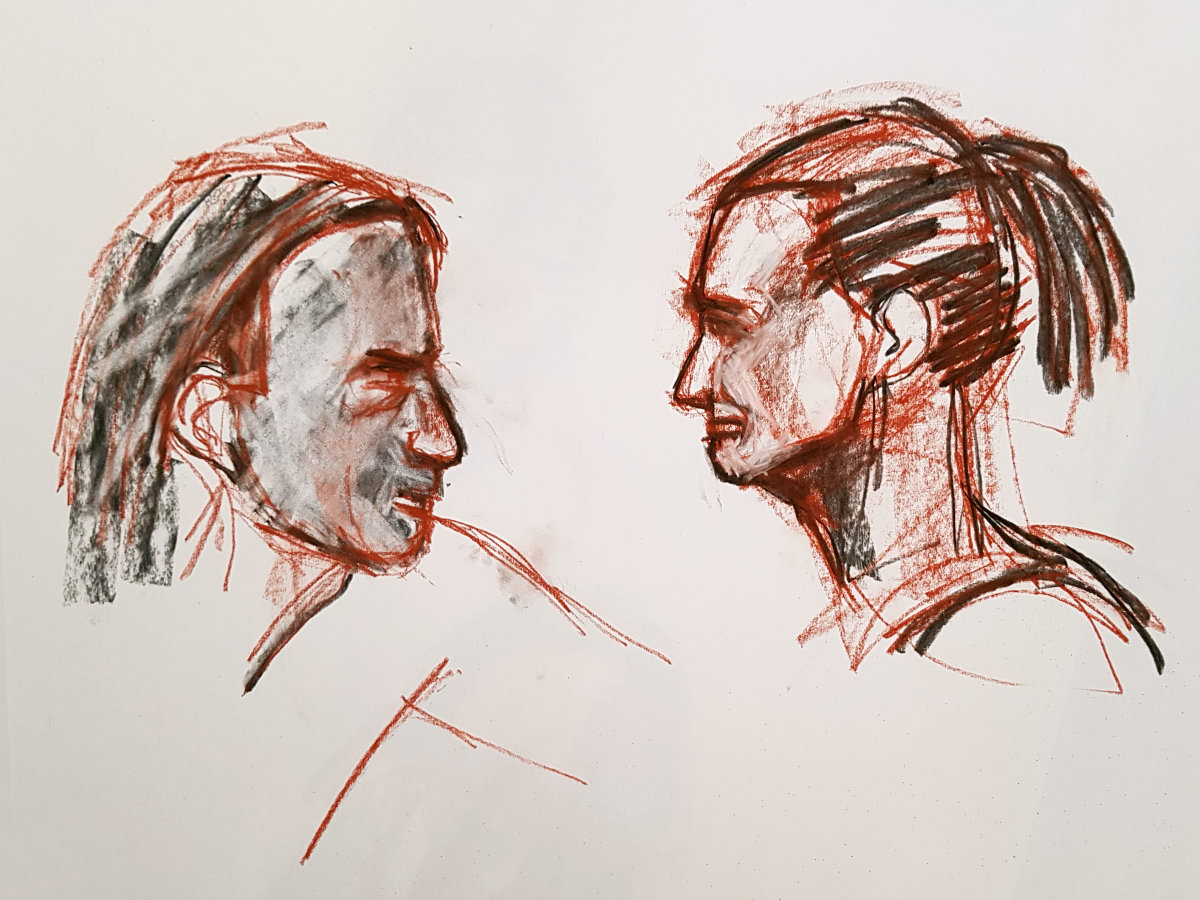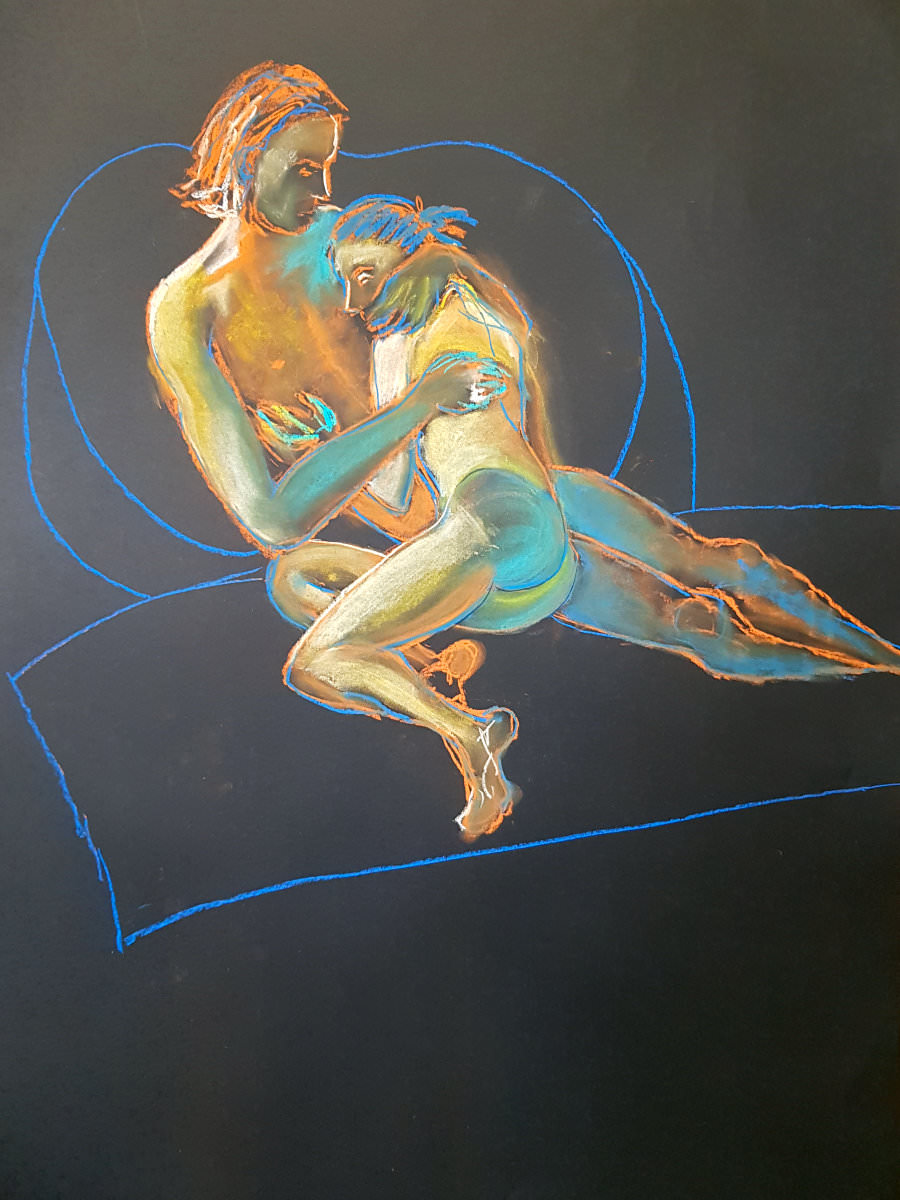 I’m never sure if it’s confidence, bravery, complacency or folly that motivates artists to attempt capturing two intertwined figures in just 60 seconds. Whatever the case here, it was done staggering well. The best I’ve ever seen for duo poses at such speed. We resumed with a 15-minute pose for which we were slightly apart, connected by gazing eyes and hand contact. A 45-minute reclining cuddle took us to the next break.