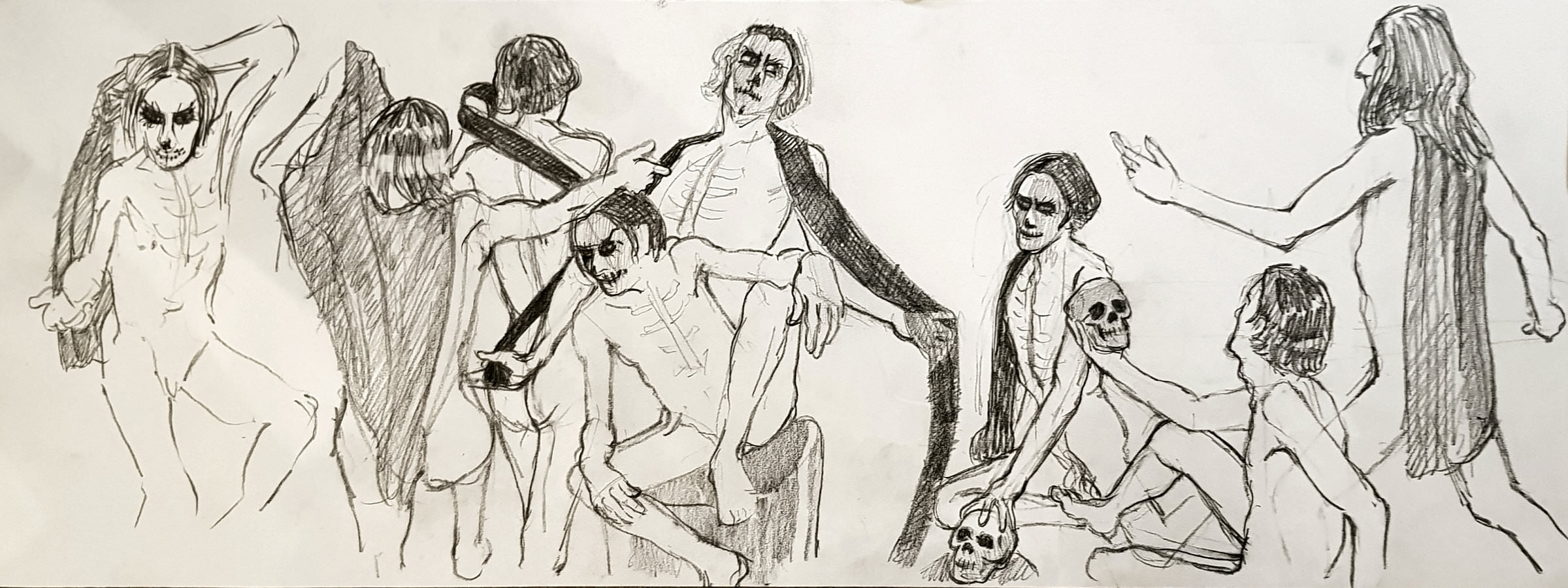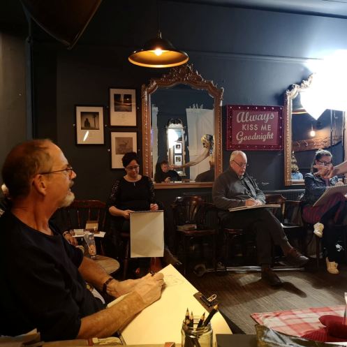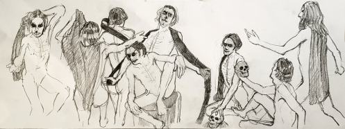 I saw out the evening by sitting upright on the floor, black material over one shoulder, my other hand resting on the skull. There was a lovely show of appreciation from the artists when Tatiana called time, and not only in the tips jar – but thank you! Rather, I think everyone got into it, and what started as a novelty actually elevated their work.