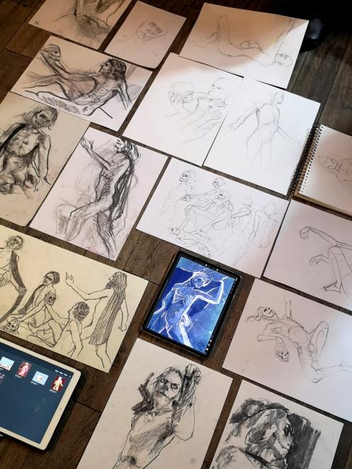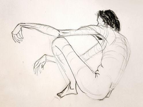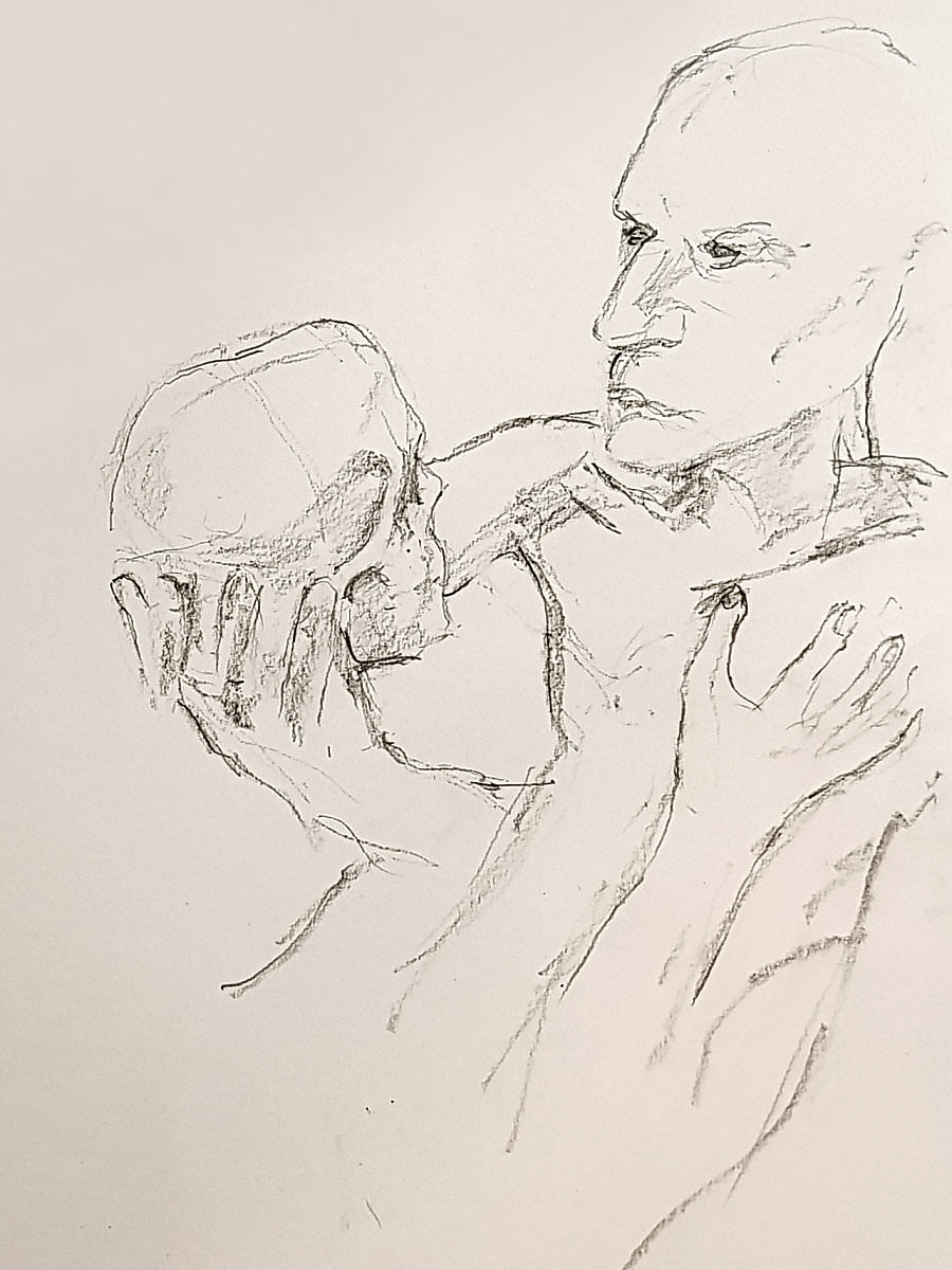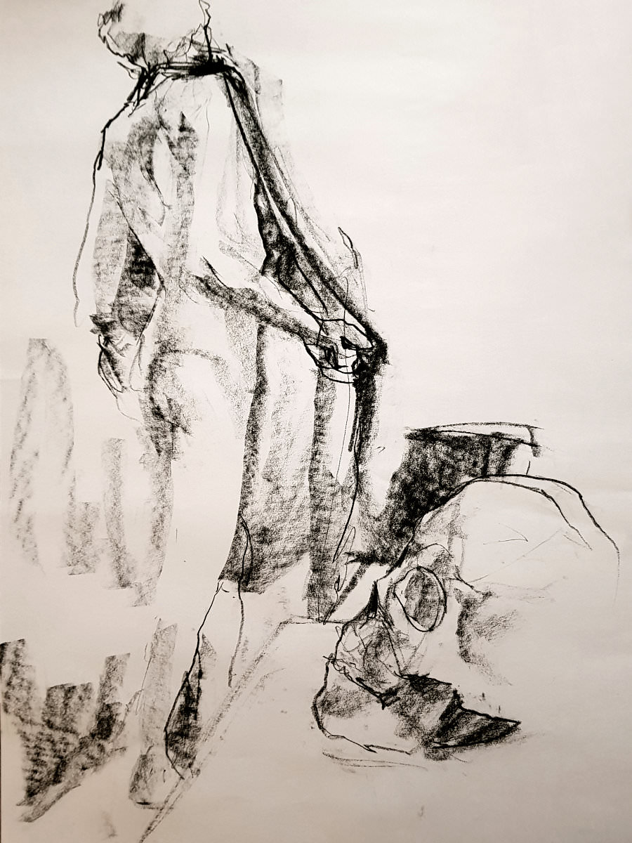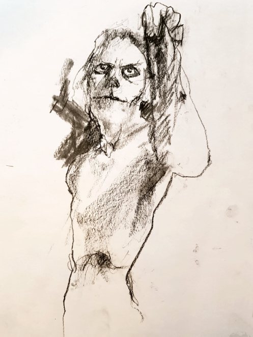 For the 15-minute pose before our break I sat gazing into the lifeless eyes of a plastic skull – my final prop. By now I was feeling in good shape and having fun. Our second half would have poses of 10, 15 and 20 minutes. To start these, I stood with the black material draped across my shoulders and held outwards in both hands at waist level.