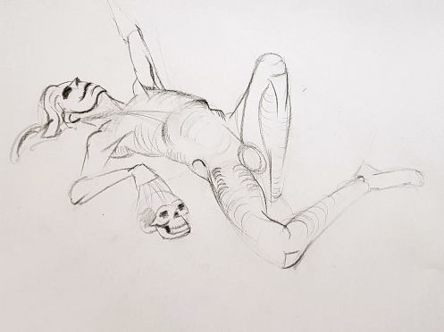 A chance encounter with Tatiana Moressoni on a Brockley street corner… the next day I’m kindly invited to model on Monday and Wednesday the following week at her south London life drawing groups… but I can’t do Wednesday as I have a Halloween booking that evening… so we confirm Monday… and say: “We’ll do Halloween too!”