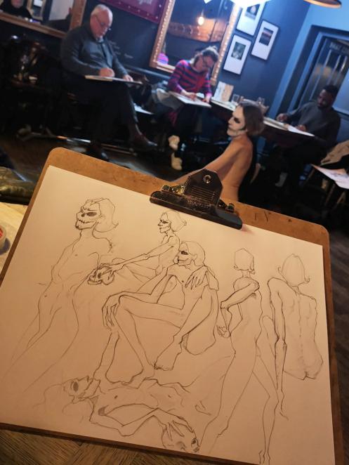 Drawings were spread across the floor and received much admiration. Artists finished their drinks and consumed the remaining trick-or-treat sweets that Tatiana had placed on every table, while I scrubbed away my body paint in the pub’s bathroom. Normality was restored. It had been a very good night at Anerley and Penge Life Drawing.