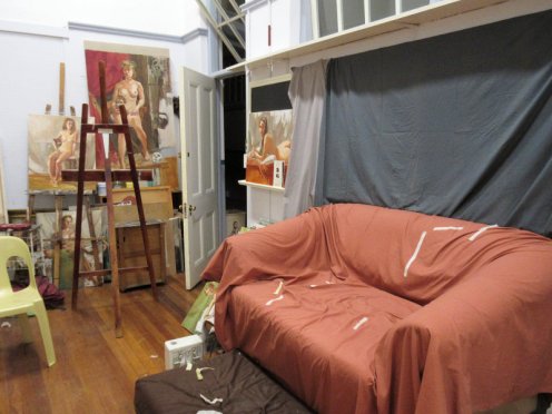 Once everyone who’d been expected was present, we settled comfortably together on a sheet-covered sofa. The group was friendly and welcoming, but when the art started they drifted into a quiet focus – the only noise came from window shutters that banged in the wind. We remained motionless for the first hour of what would be a 2-hour pose, with a tea break midway. Excellent works had already emerged by half-time.